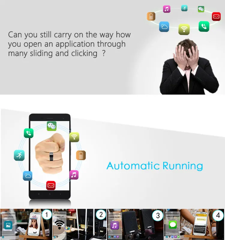 User can select one or multiple programs in the edition menu of “automatic Running” and design operation scripts for different phones. To enable an operation script in any environment, user can operate in corresponding Smart ring.