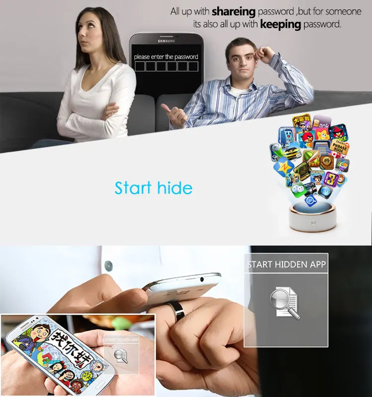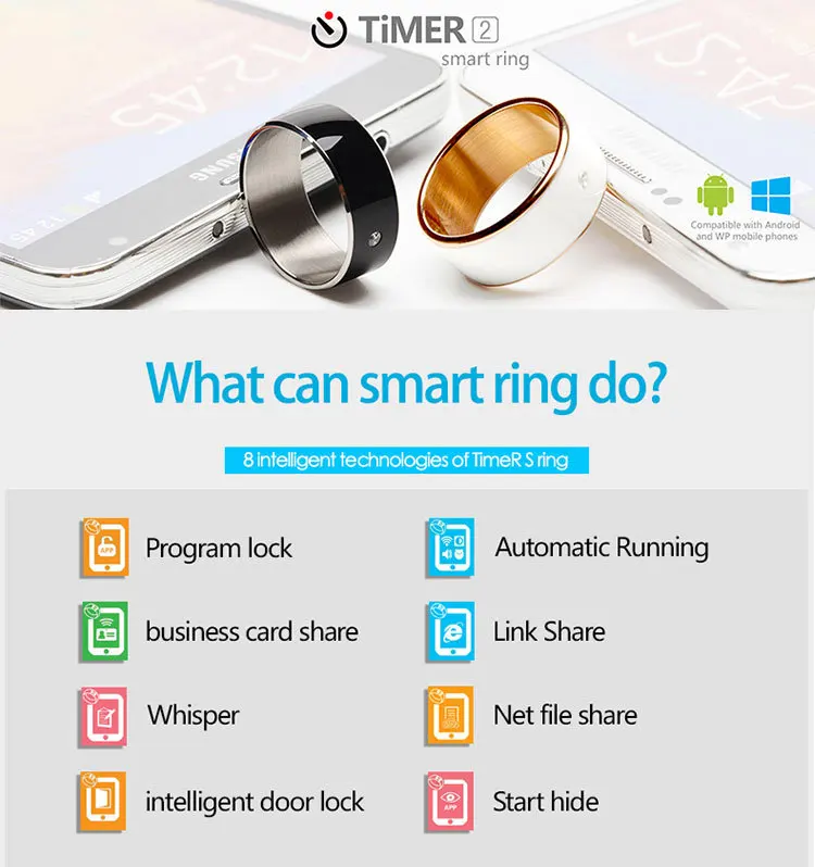 The smart magic ring is a wearable gadgets components, runs magic functions on mobile phone, and operate the mobile function and share the data by NFC wireless frequency communication technology , the functions of the advanced design as following: APP lock,Automatic Running, APP hide, Share business card, Share internet link, Share the text and Share online file. The product shape is designed according to the international popular elements, created by the pure medical titanium, no need to charge, high waterproof, and suitable for any people at any time.