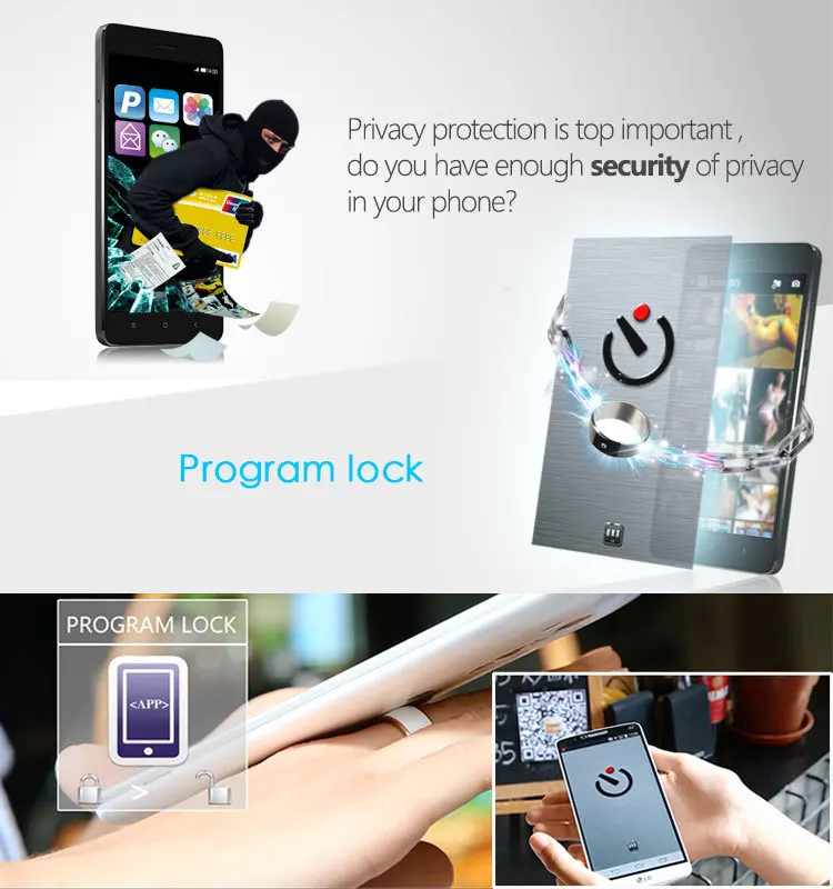 User can select a program to be locked from the menu of “program lock”. After the program is locked, user should contact the mobile phone with Smart ring to run the program.