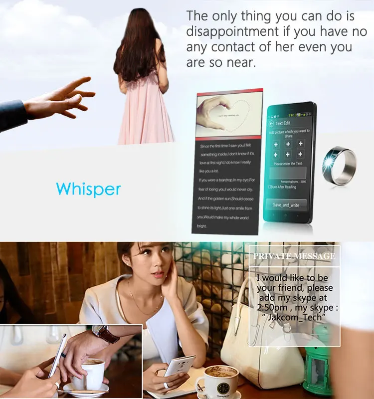 User can edit the content of text in the menu of “Whisper” and write in the ring. Afterwards, wherever user contacts the mobile phone of NFC function, the mobile phone will automatically pop out the edited text content. The product is the first device in the world which can add 6 images and 2000 characters to a piece of NFC codeword and enables “delete after reading” function, and is compatible with all Android and WP mobile phones.