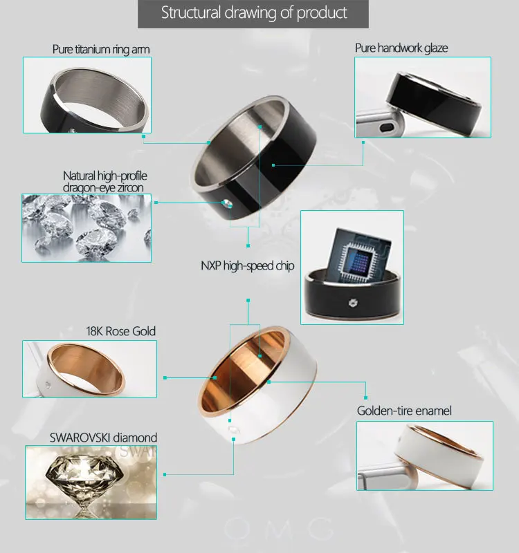 N X P NFC chip, there are two built-in NFC chipsets in the ring which are sealed inside the zircon/diamond and the other side of ring. Each chipset can be programmed for different functions. New-typed chip is matched with new NFC antenna which improves the receiving and sending capacity of magic ring by another 10% basic on the last generation, and again effectively guarantees the good use in all brands (please guarantees zircon/diamond is located in the center of finger. The optimal reading and writing performance of chips in each area can only be guaranteed by correct wearing).