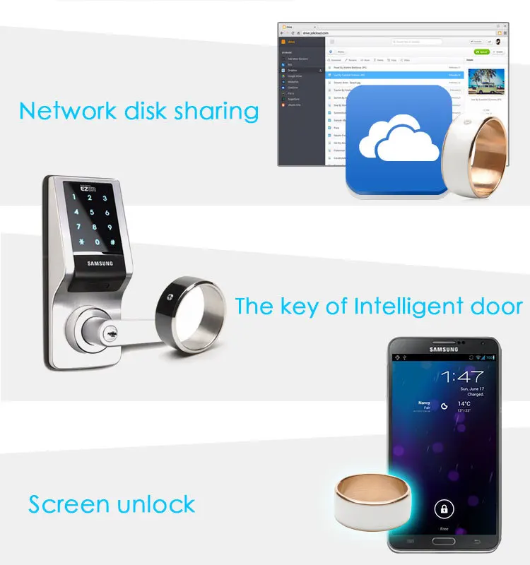 User can set Smart ring as the key to door according to the matching process of intelligent door lock. It supports most intelligent door locks of 13.56MHZ in the market, for example, S a m s u n g series.