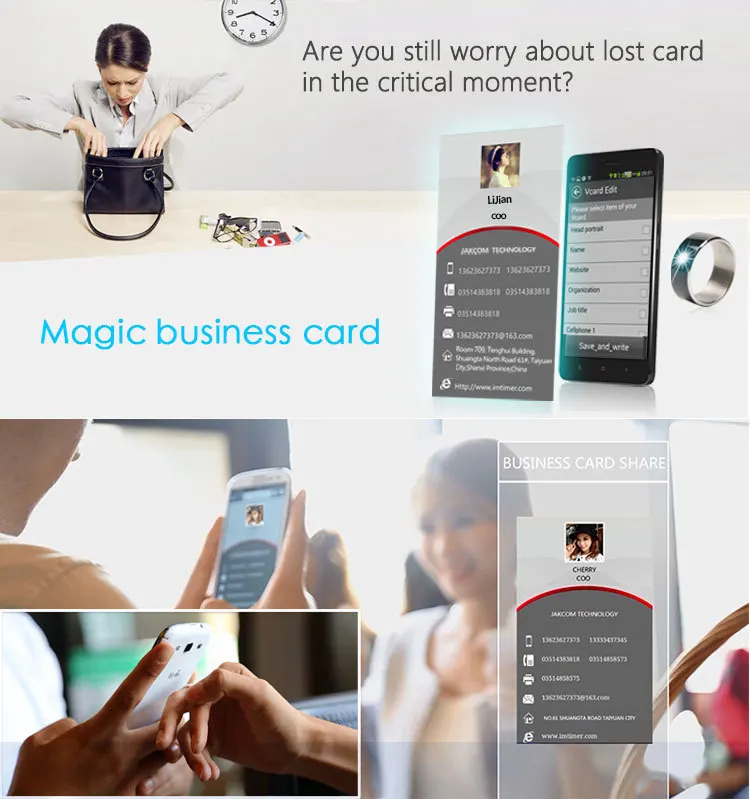 User can edit the content of business card in the edition menu of “wireless magic card setting” and write in the content. When the back of hand wearing the ring enters the NFC range of other mobile phones, the magic ring will automatically display and import a preset business card. The first NFC device in the world which can share image and business card information, is compatible with Android and WP mobile phones.