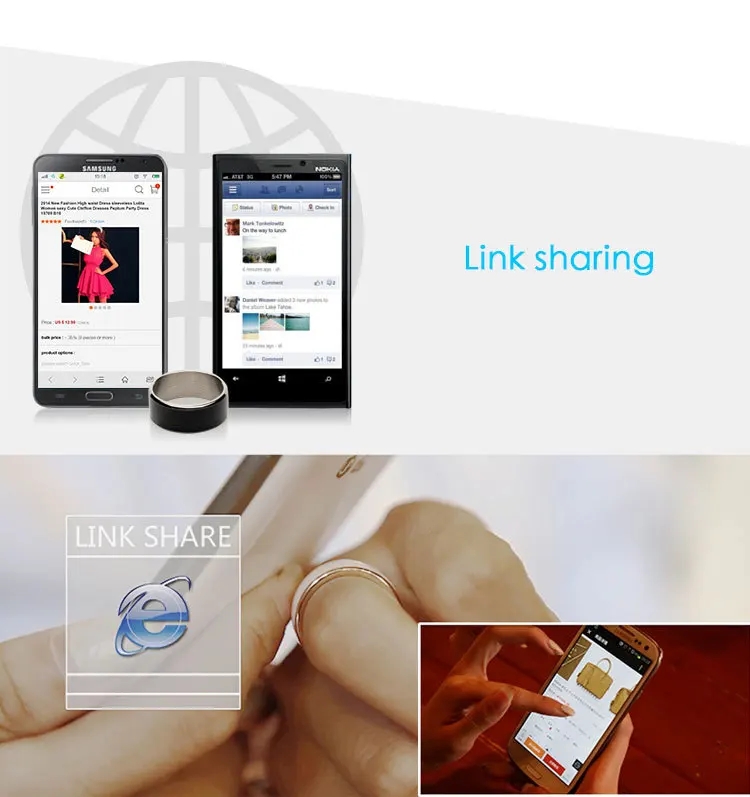 User can edit URL links in the menu of “link write-in” and import to Smart ring, or by explorer sharing function. Afterwards, wherever user contacts the mobile phones with NFC function, the mobile phone will automatically pop out the content of shared pages.
