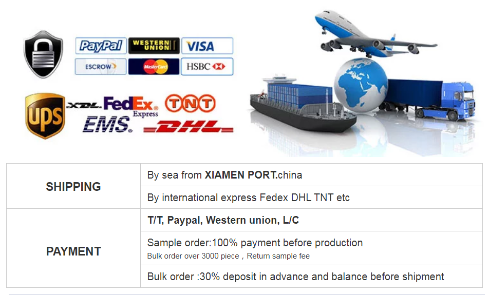3) Bulk order of more than 3000 pieces,Sample refund fee 4) Bulk order:30% depositPrepayment and balance before shipment