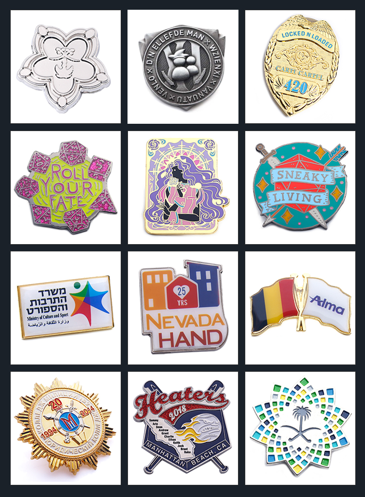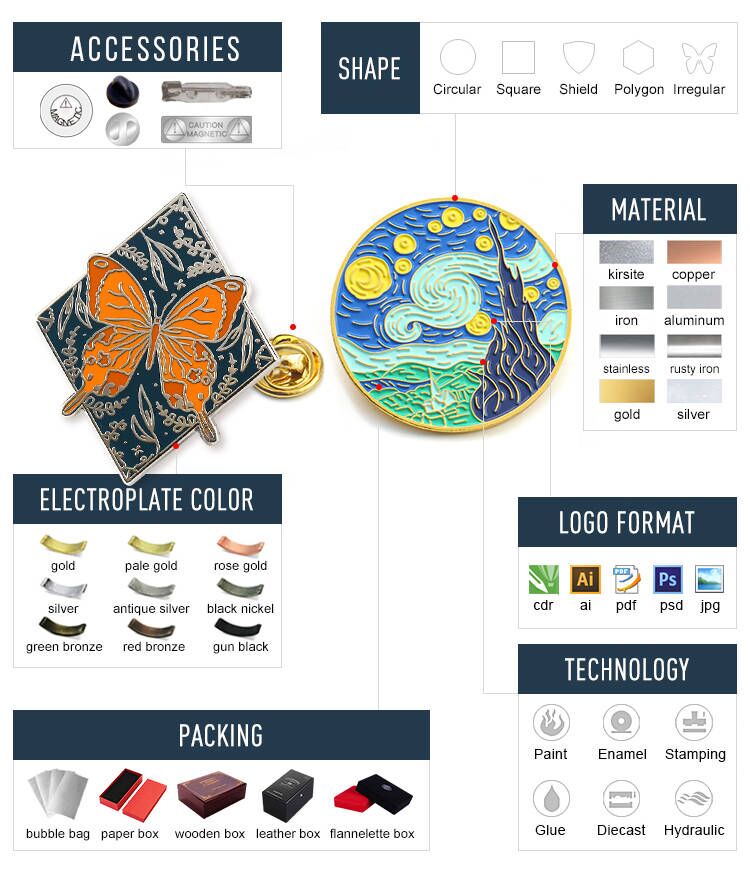 | logo | Enamel, paint, epoxy paint, embossing, laser, screen printing. |