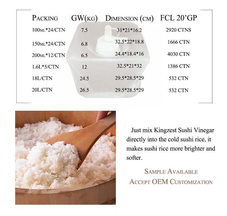 KINGZEST sushi vinegar has a appropriate taste with sweet and sour which will make rice tasty, suitable for all ages to eat.