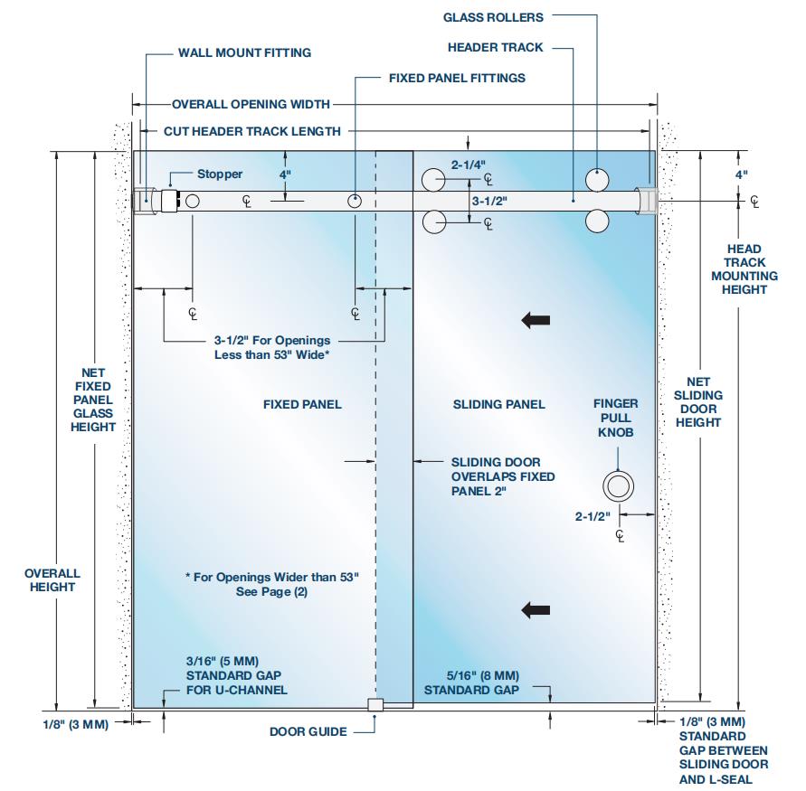 Sliding and fixed glass panel width = total width divided by 2, add 7/8"