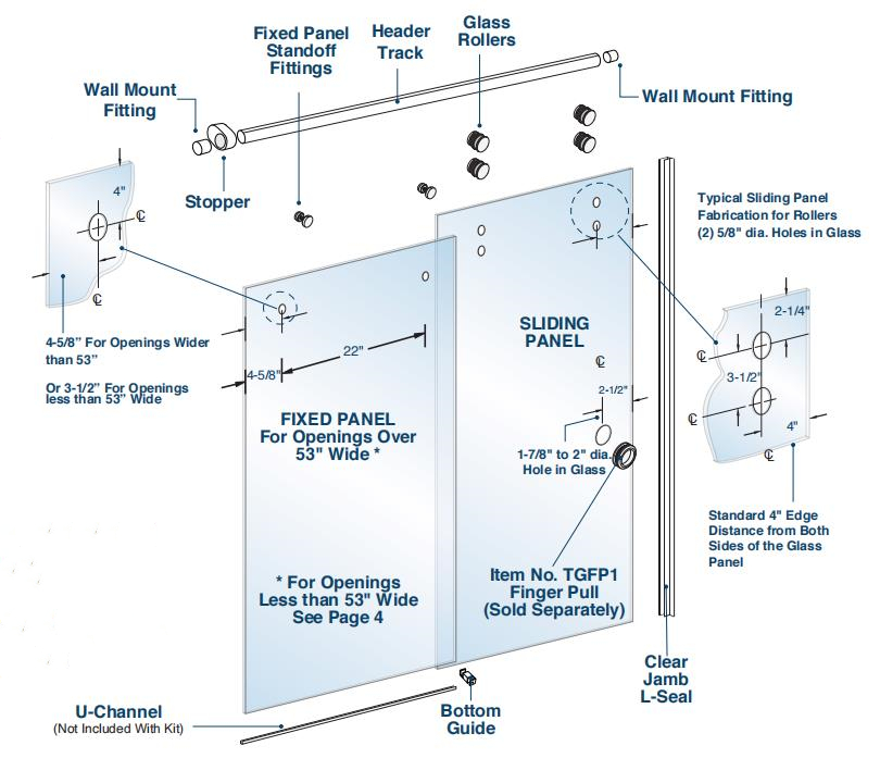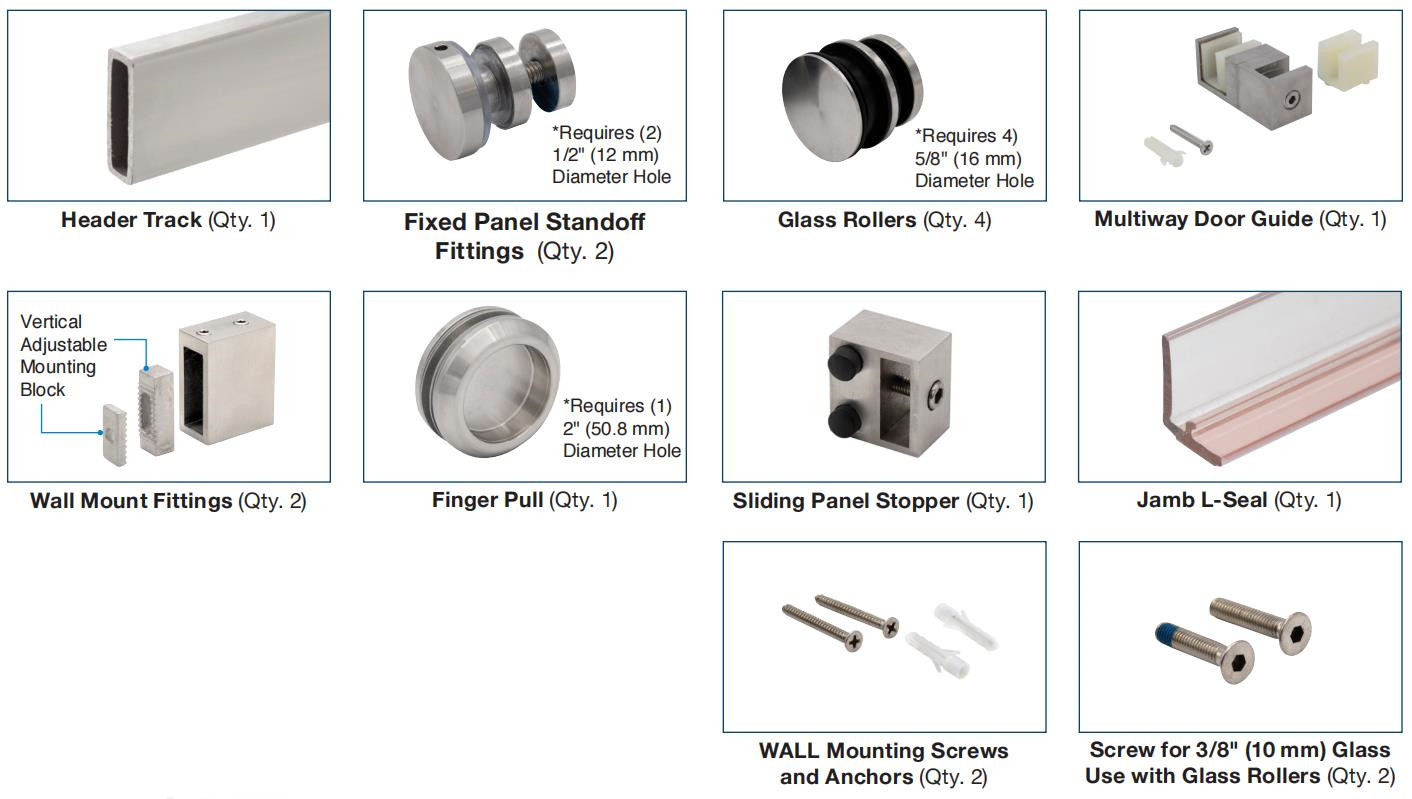1 - 78-3/4" (2 m) ram length 4 - Stainless steel rollers 1 - stopper 2 - Wall track bracket accessories 2 - Fixed panel 1 - Pull through the glass 1 - Bottom Guide 1 - 80" (2.03 m) clear L-shaped jamb |