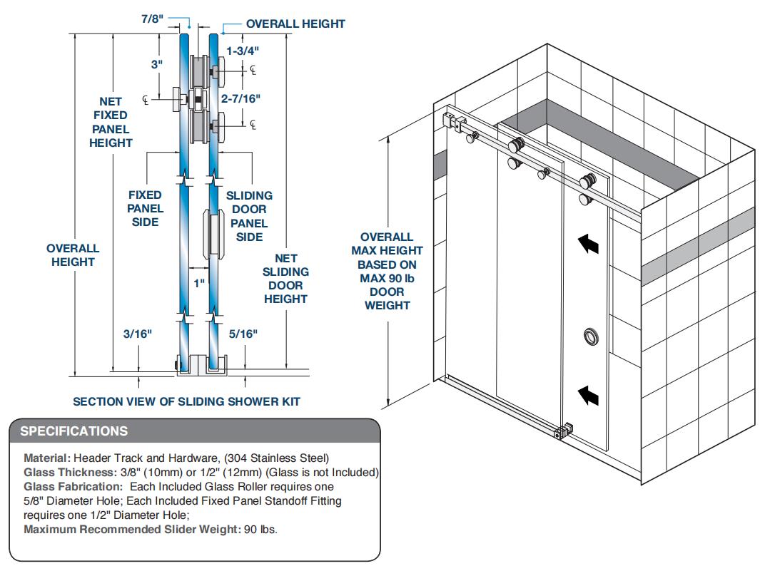 thisSER78 Serenity Series Frameless Sliding Shower Door KitOffers a modern, understated design including a rectangular top bar and round glass rollers. It is designed for use with 3/8" (10mm) or 1/2" (12mm) tempered glass. Each top glass roller requires a 5/8" (16mm) diameter hole in the glass for proper installation. Precision bearings and wheels also provide a quiet sliding experience.