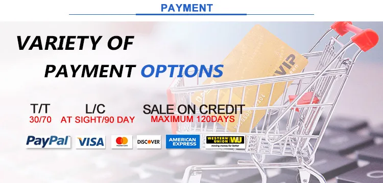 Generally we adopt T/T, LC, Western Union, PayPal, Money Gram and Alibaba Trade Assurance.