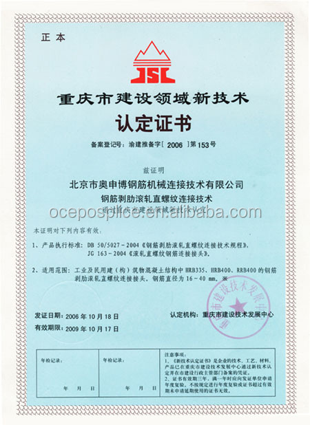 Thread rolling does not cut threads and thus preserves the highest tensile strength of the base metal. Meet the requirements of JGJ107, ACI318, BS8110, DIN1045, UBC1997, etc.