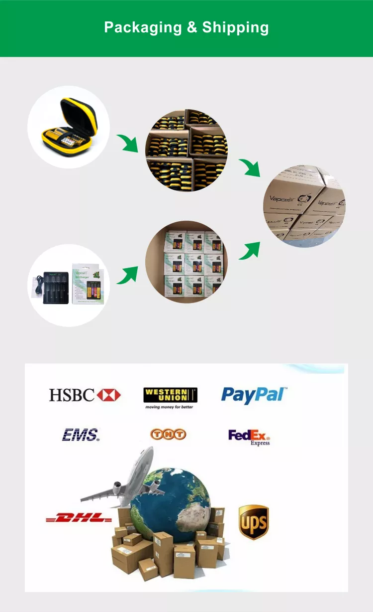 each2batterYespackaged in aVapcell zipperBoxor plastic box,Standard 10kg batteryVapselExport cartons.