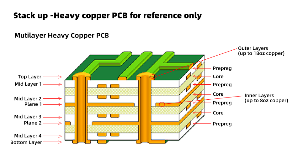 Heavy copper PCB is a circuit board with copper thickness ≥3oz per sq. ft in both outer and inner layers. The reason for classifying a board as a heavy copper PCB is its thicker plating. During the production of thick copper PCBs, copper thickness is increased by plating holes and sidewalls.