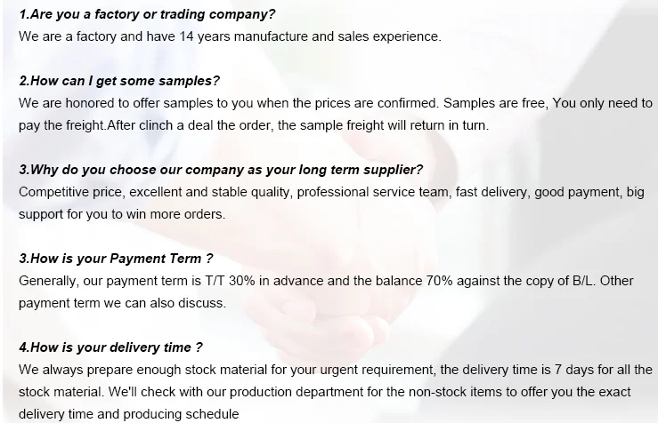 | OEM and ODM: | Acceptable; | Payment Terms: | L/C,D/A,D/P,T/T,Western Union,MoneyGram,30% deposit before production,and balance against copy of B/L by T/T.; |