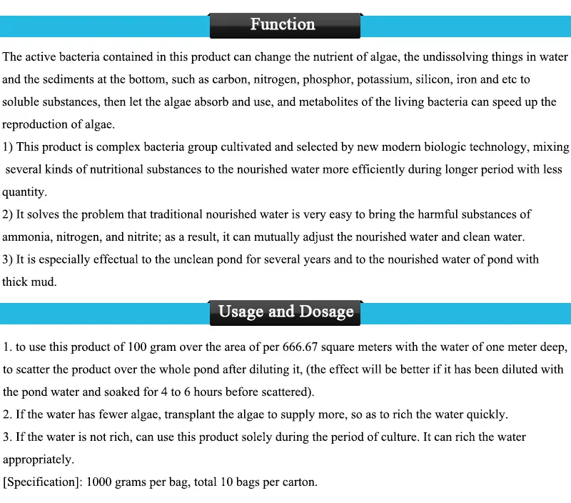 [Main functions]: The active bacteria contained in this product can change the nutrient of algae, the undissolving things in water and the sediments at the bottom, such as carbon, nitrogen, phosphor, potassium, silicon, iron and etc to soluble substances, then let the algae absorb and use, and metabolites of the living bacteria can speed up the reproduction of algae.