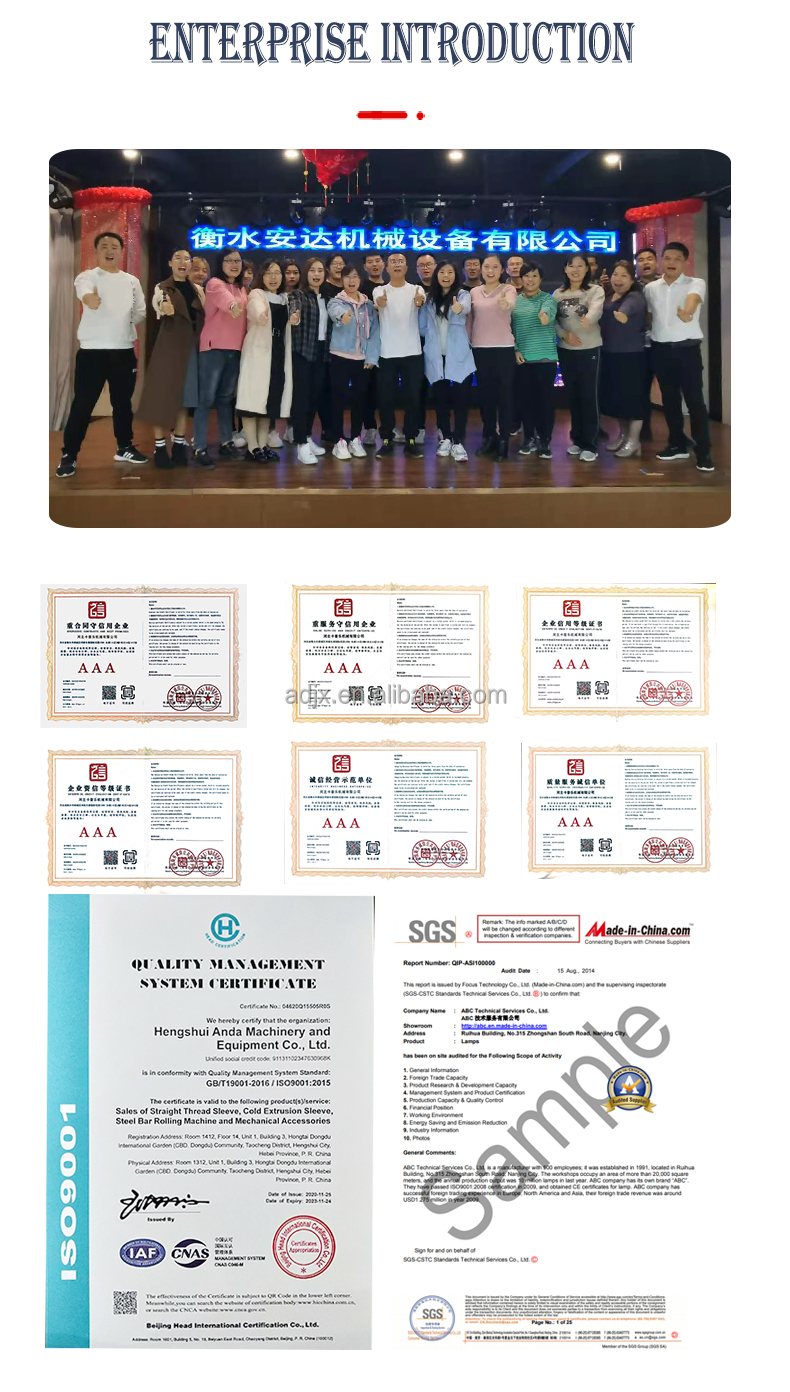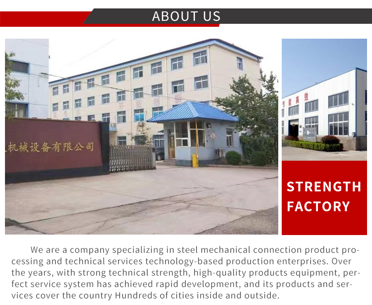 Today's ANDA is a thriving company with continued growth in its workforce, a constant commitment to technology, and key businesses: Rebar Connectors and Rebar Connecting Machinery, including HRB500 Straight Thread Rebar Connectors and Rebar Reducers, Cold Extrusion Presses Rebar connectors, grouted rebar connectors, rebar thread rolling machines, fully automatic rebar upsetting machines, cold extrusion machines, portable rebar cutting machines and rebar bending machines, rebar straightening and cutting machines, rebar cutting lines and rebar bending machines, Rebar connector production line, automatic rebar head thread line, etc. Widely used in construction of buildings, bridges, tunnels, subway culverts, viaducts, etc. At the same time, Anda Factory can provide various steel bar connection technologies and on-site services.