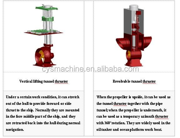 Tunnel propellers are divided into CTT controllable pitch propellers and COCC fixed pitch propellers, generally including prime mover, hydraulic system, remote control system and the propeller itself. The prime mover is usually an electric motor; sometimes it can be a diesel engine or a hydraulic motor, which can work under S2-30, S2-60, and S1; the remote system can be connected to Joystick and DP interfaces. The thrusters themselves can be transformed into a retractable configuration when connected to hydraulic cylinders.