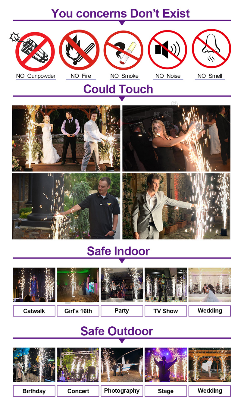 Indoor powder spark height is 0-3.5m, outdoor powder spark height is 0-5m