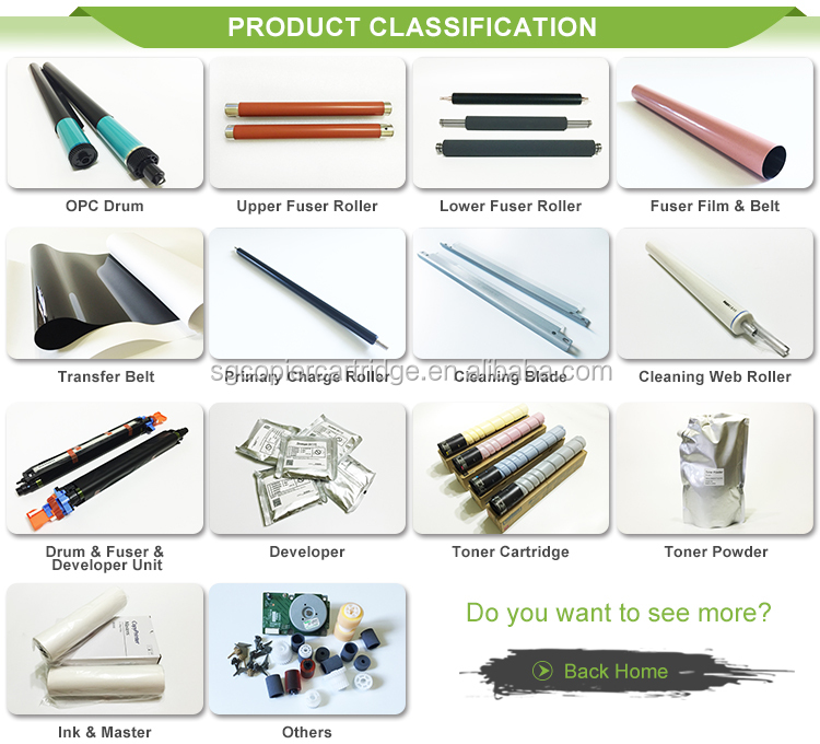 spare parts: OPC Toner Cartridge, Upper Fixing Roller, Lower Fixing Roller, Fixing Film, Fixing Belt, Cleaning Blade, Screen Roller, Developer, Gear, Chip, etc.