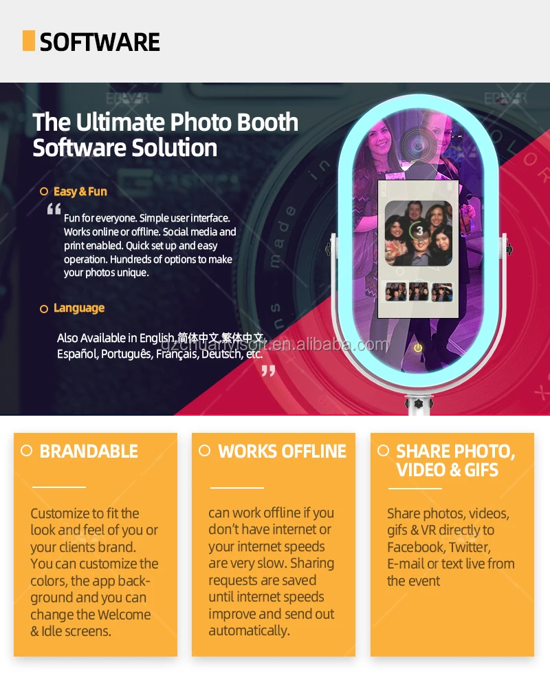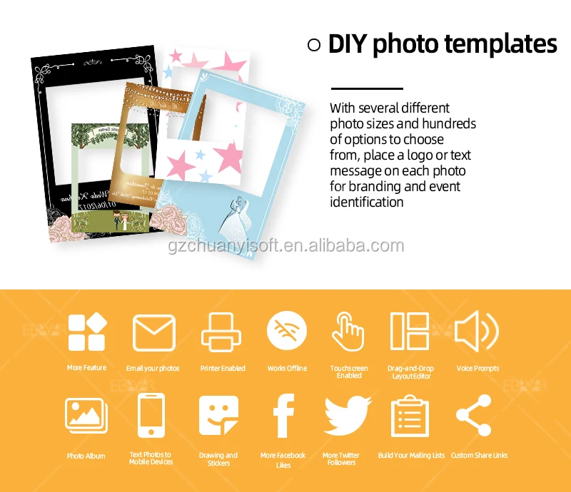 - Photo Booth Software: Simple user interface, can work online or offline. Pictures can be branded with logos, hashtags, colors and customized designs. It's perfect for party, wedding, events sharing or marketing.