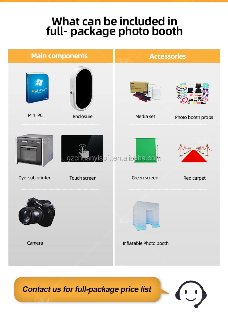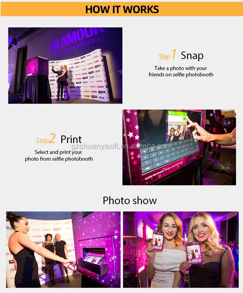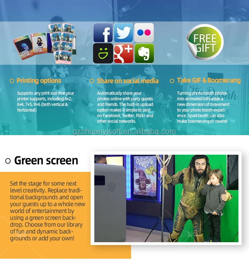 | Material | Metal enclosure with metal stand | 1. Instant Printing 2. Advertisting Photos 3. Share on Social Media 4. Green Screen 5. Gif Photos 6. DIY Signsture 7. Multiple Copies |