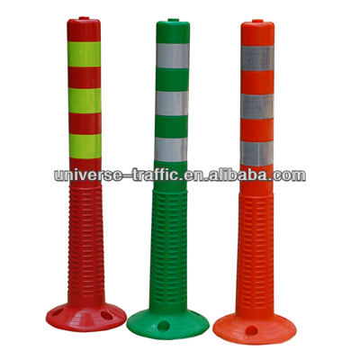 Virtually indestructible highly visible flexible warning bollard. Bright colors are accented with reflective tape for better nighttime visibility. Used for lane delineation or identifying hazards, especially in stressful driving situations such as parking lots.