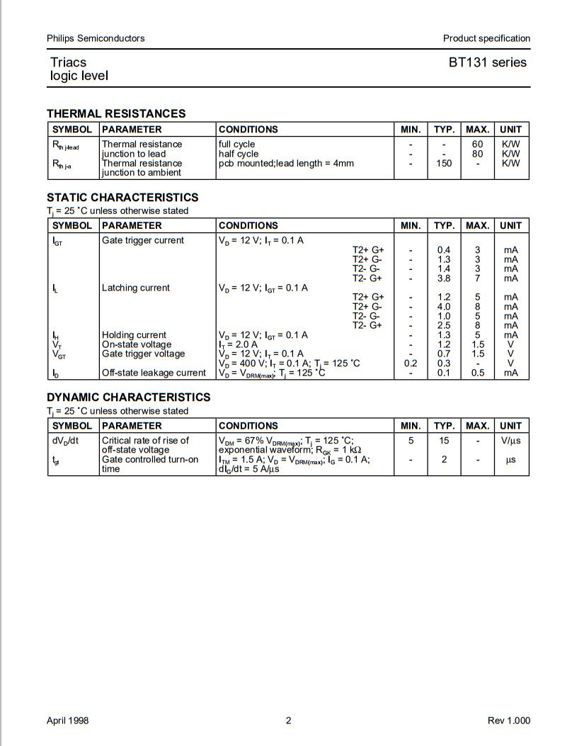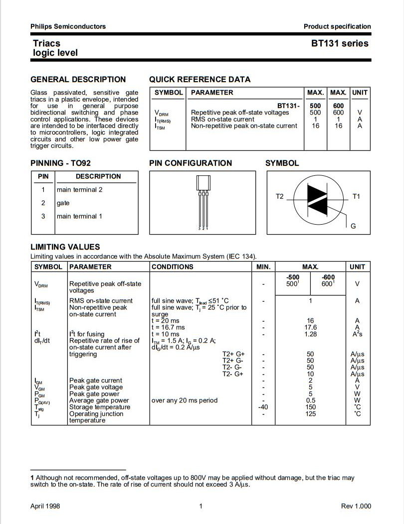 Triacs Thyristor 600V 1A BT131 TO-92 Bidirectional Thyristor BT131-600