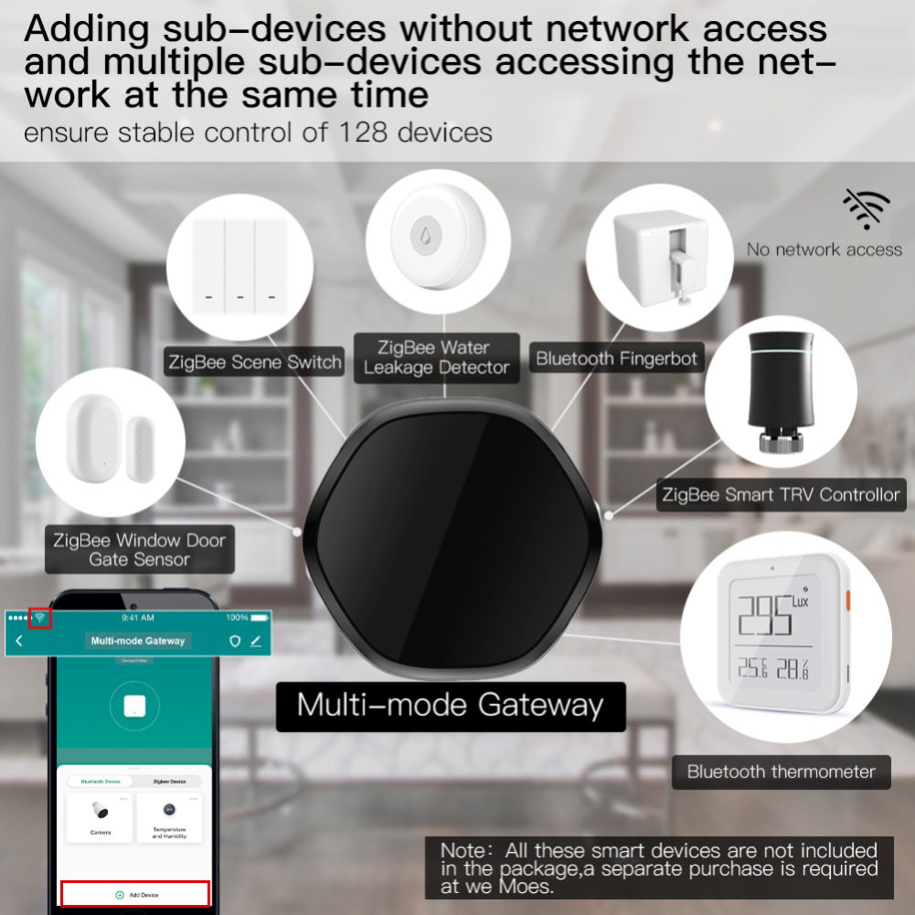 1) Support 50+ sub-devices online at the same time, door sensors, water sensors, human sensors, etc.