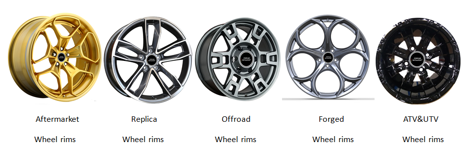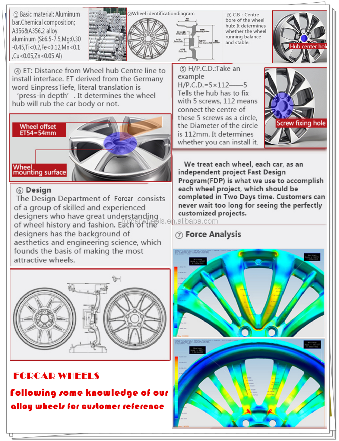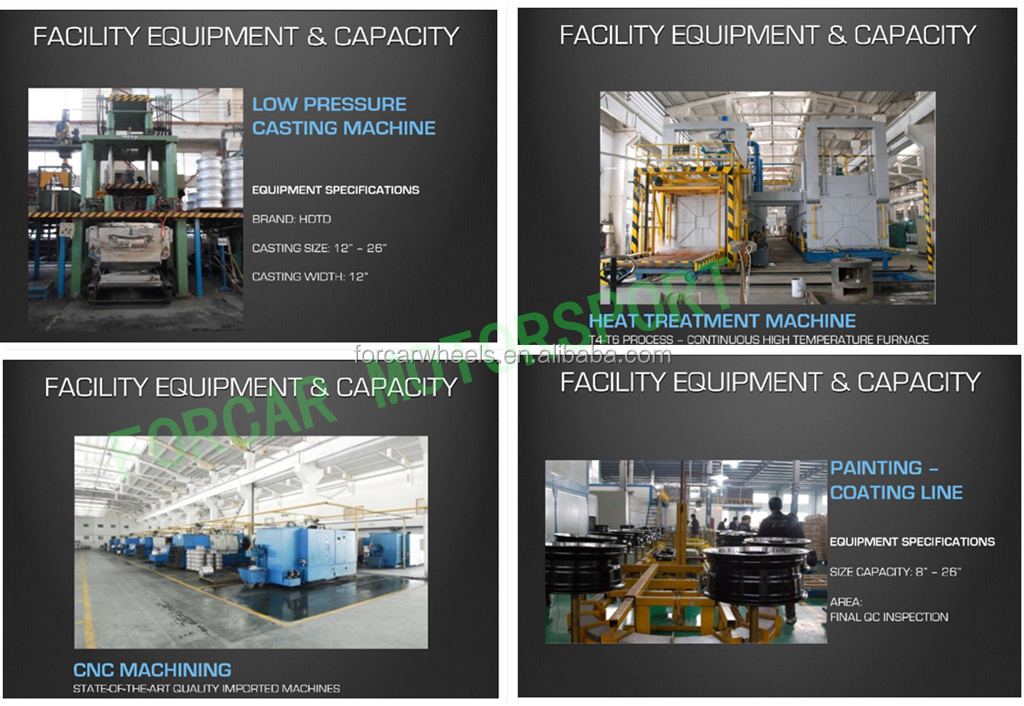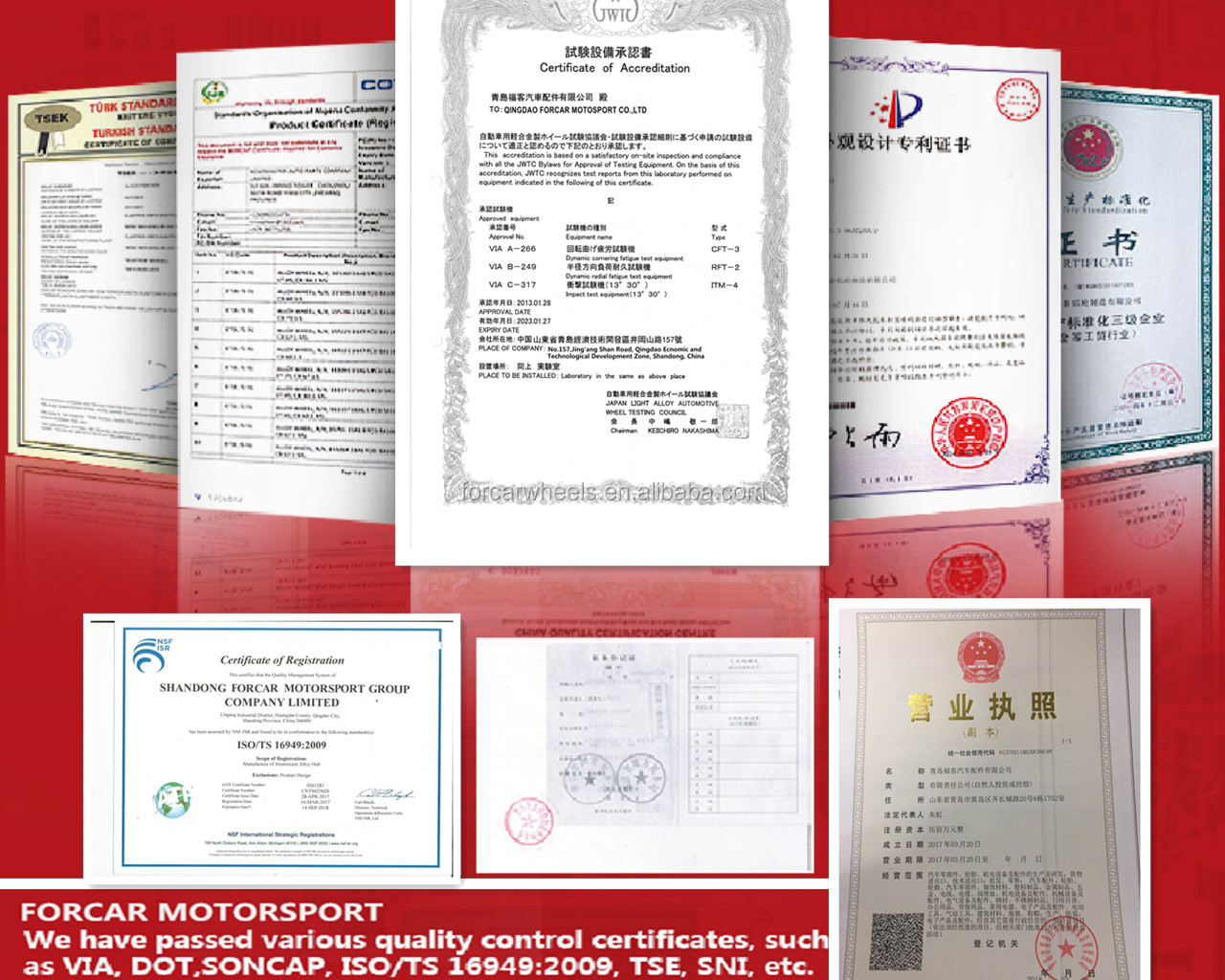 Forcar aluminum A356.2 cast and T6 forged alloy wheels in sizes from 10" to 28" with VIA, JWL, TUV, ISO, DOT certificates;