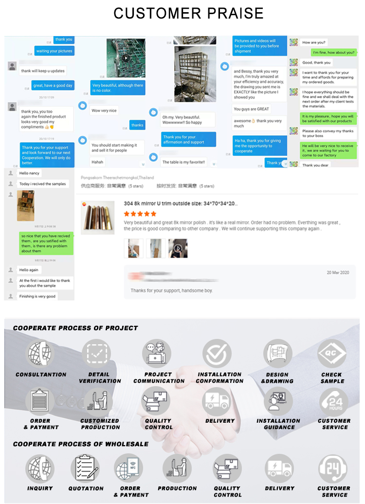 A: We are a stainless steel factory, specializing in the production of stainless steel partition screens/room dividers, SS sheets/sheets/coils, decorative strips and other customized products with various surface treatment processes. |