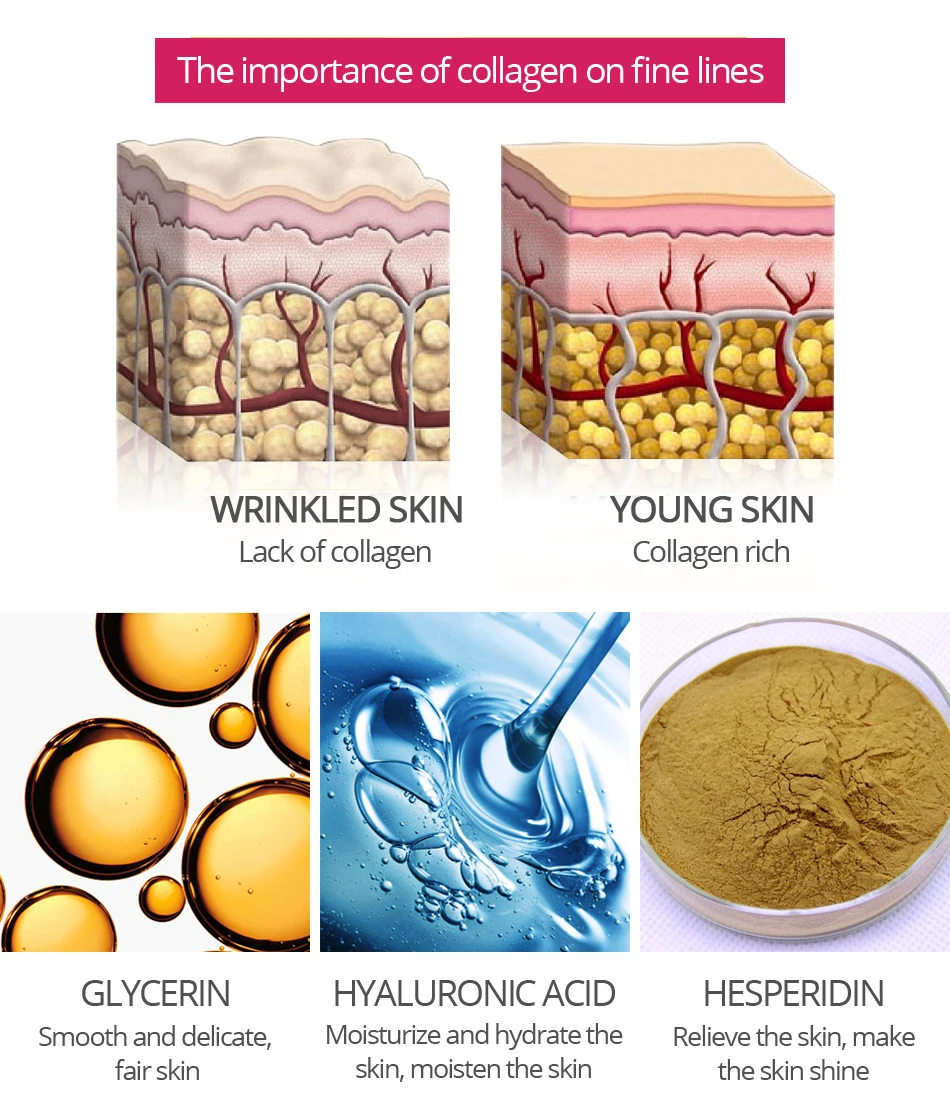 1. The ingredient is peptide collagen, which can lighten the fine lines, tighten the loose skin, and make the skin rejuvenate.