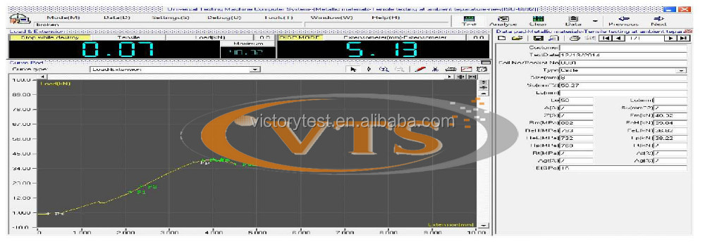 Equipped with computer, software and printer, it can display, record, process and print the test results, control the test program according to the set procedure, and automatically draw the test curve in real time. The control software can automatically extract routine data, such as tensile elastic modulus, elongation at break, non-proportional elongation strength Rp0.2, etc.