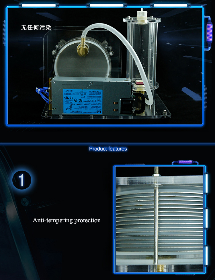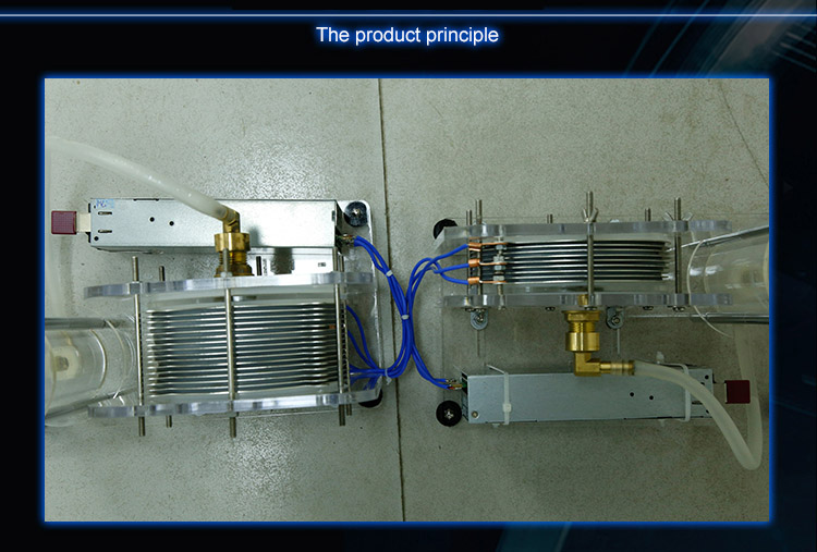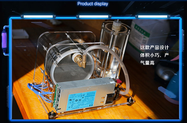 The product has the advantages of high gas production, convenient maintenance and good heat dissipation. Electrolyzed water generates hydrogen + oxygen, and hydrogen and oxygen are ignited to generate water. There is no trace of contamination in the process. Add water after the droplet, the product only consumes electricity. The product structure is designed with transparent acrylic, and the reaction process is simple. The remaining solutions are intuitive and easy to explain the principle and process. This product can be used for teaching, glass heating processing, jewelry heating processing, oxyhydrogen welding, thin metal cutting and various heating.