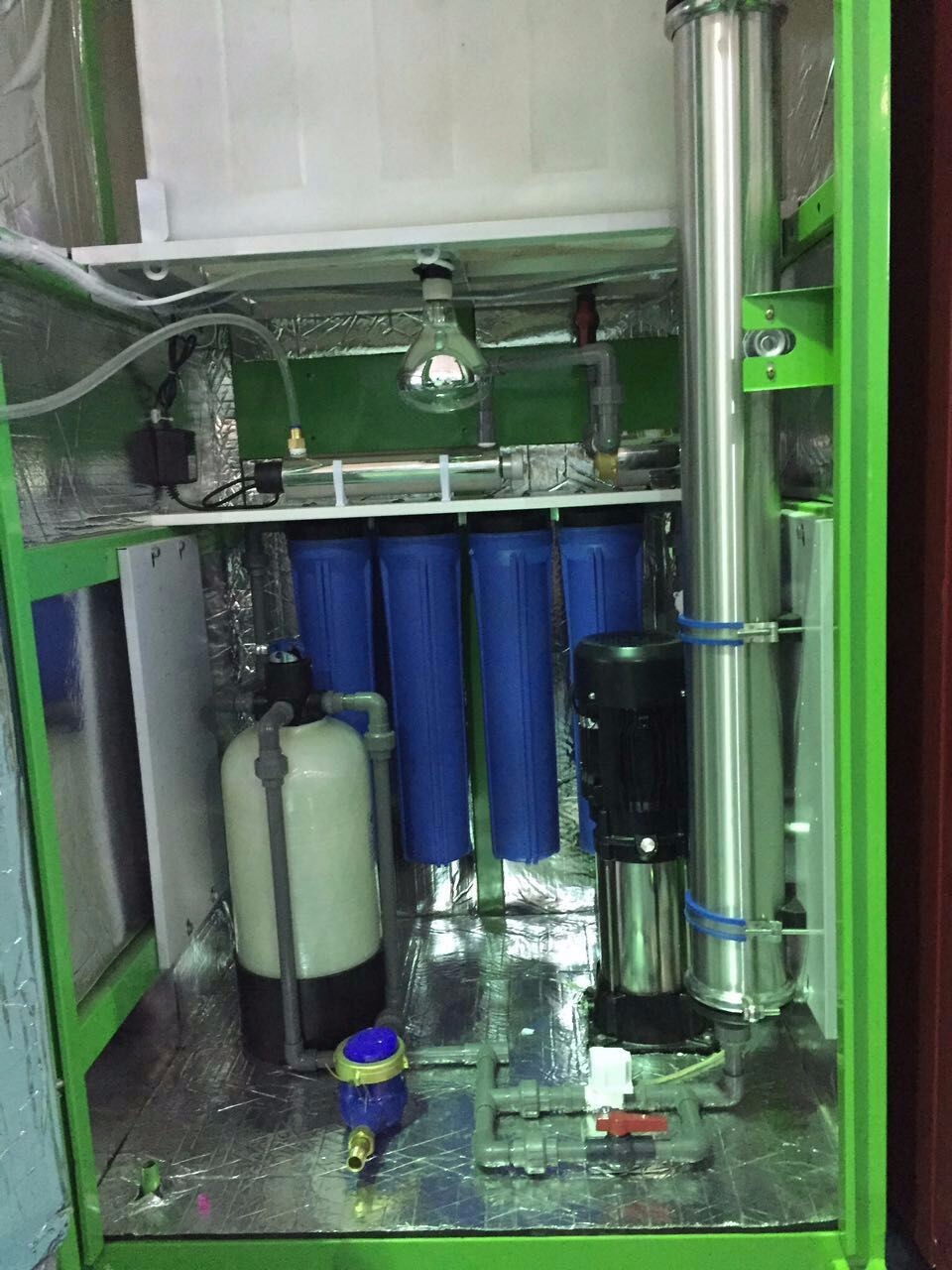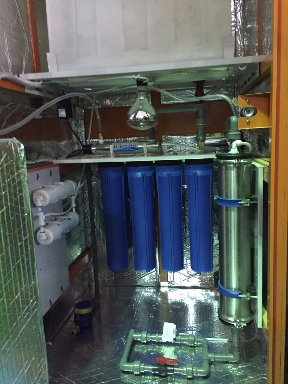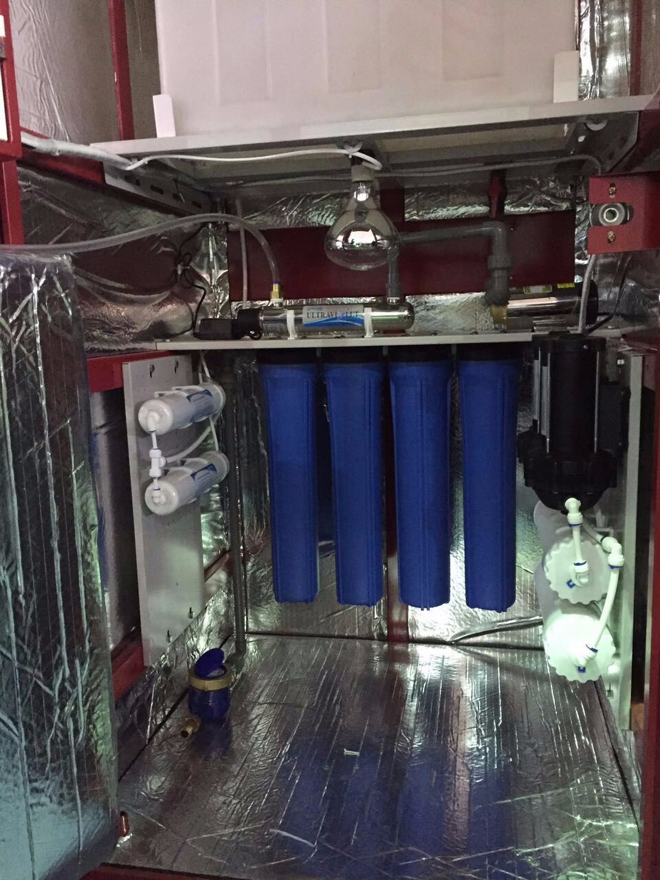 | Water storage tank: | 200 liters/food grade 304 stainless steel | Water purification system: | 9 stages including reverse osmosis system |