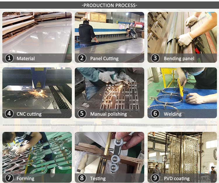 We are located in the famous production base of stainless steel and aluminum decorative materials in China - Foshan City, Guangdong Province, we areProfessionally provide design and manufacturing solutionsFor metal building decoration engineering, the main products areroom divider screen, stainless steel metal trim, stainless steel plate, stainless steel frame, stainless steel railing,smallMade of stainless steel, ETC