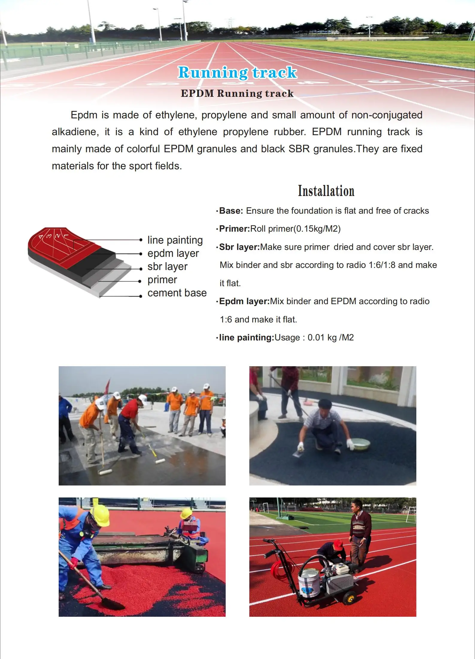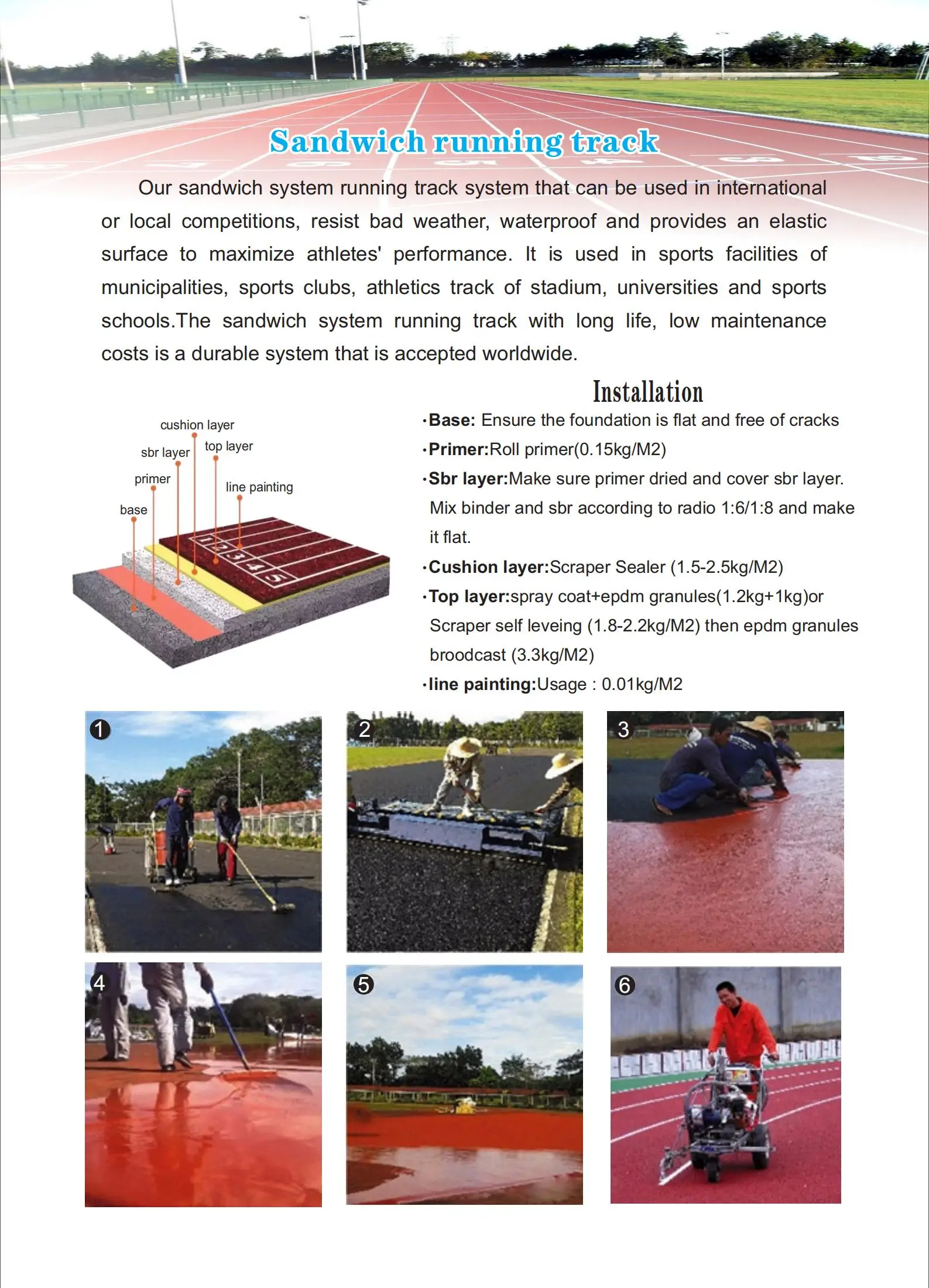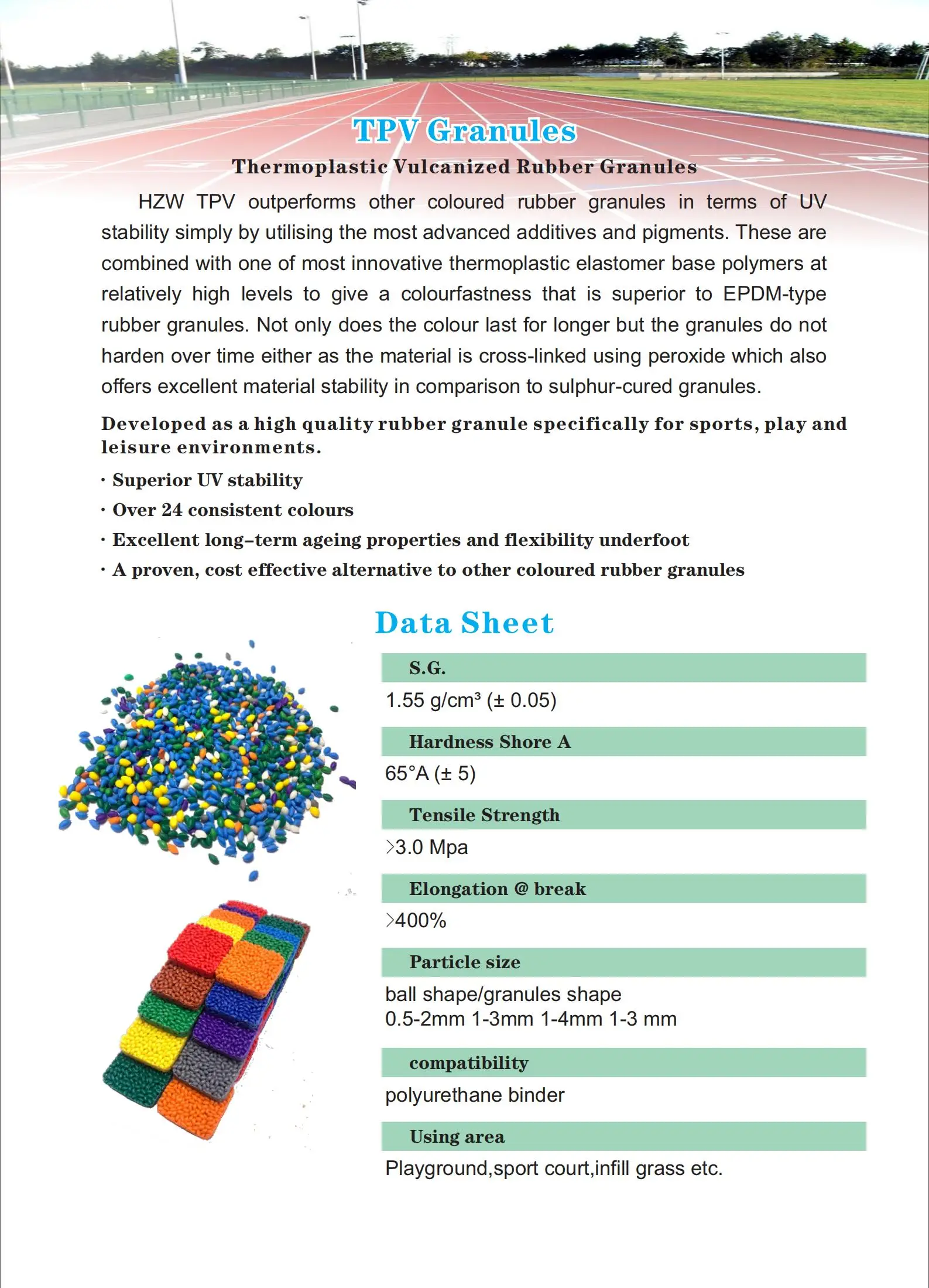 | Elongation at break: | > 700 %; | Application: | Playground,sport court,running/jogging track etc.; |