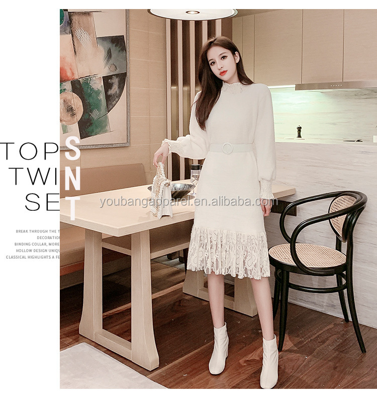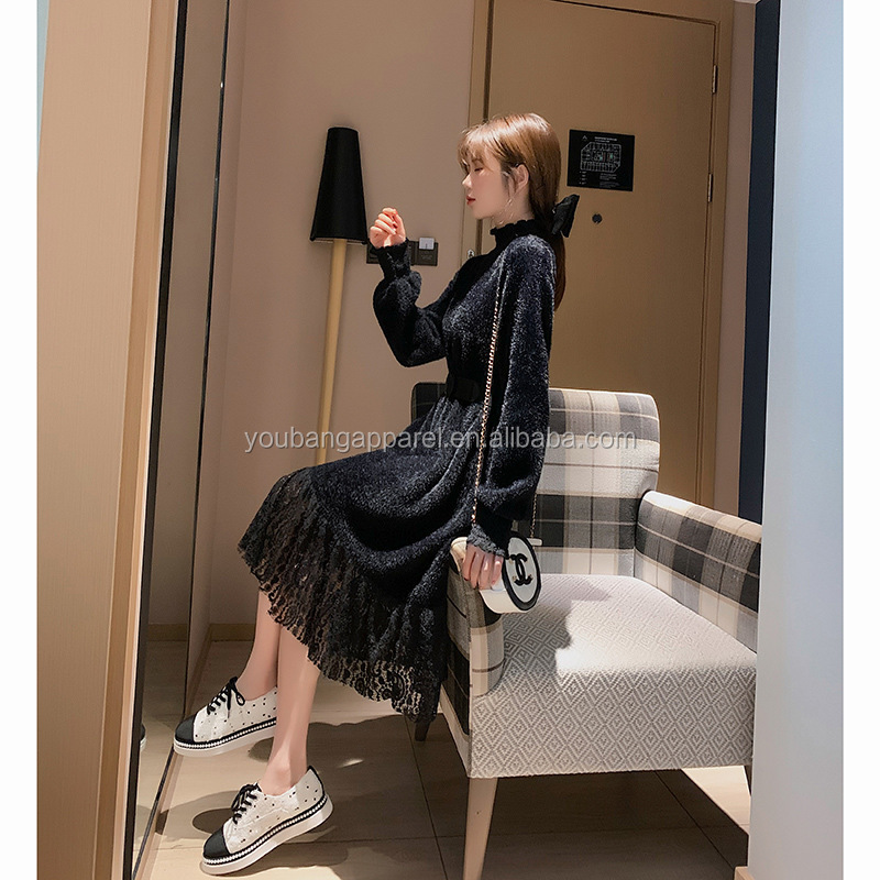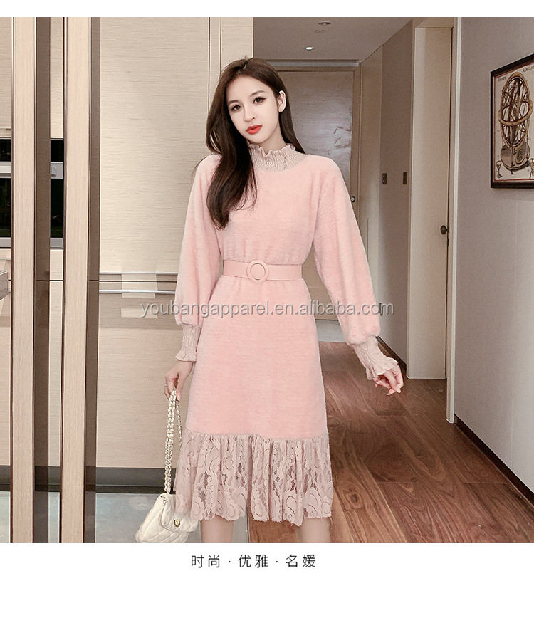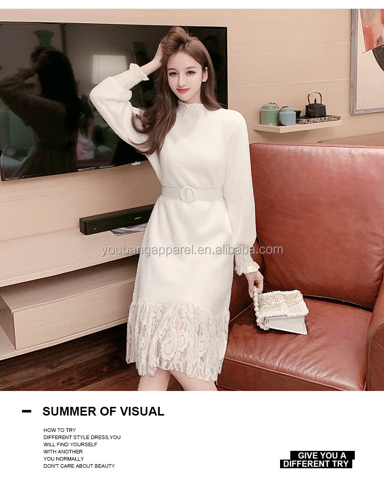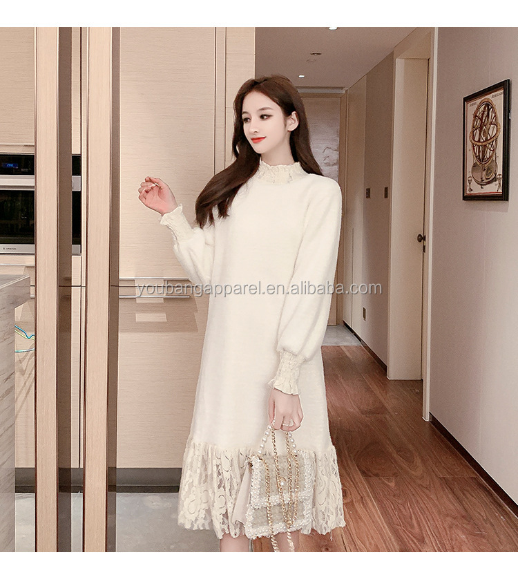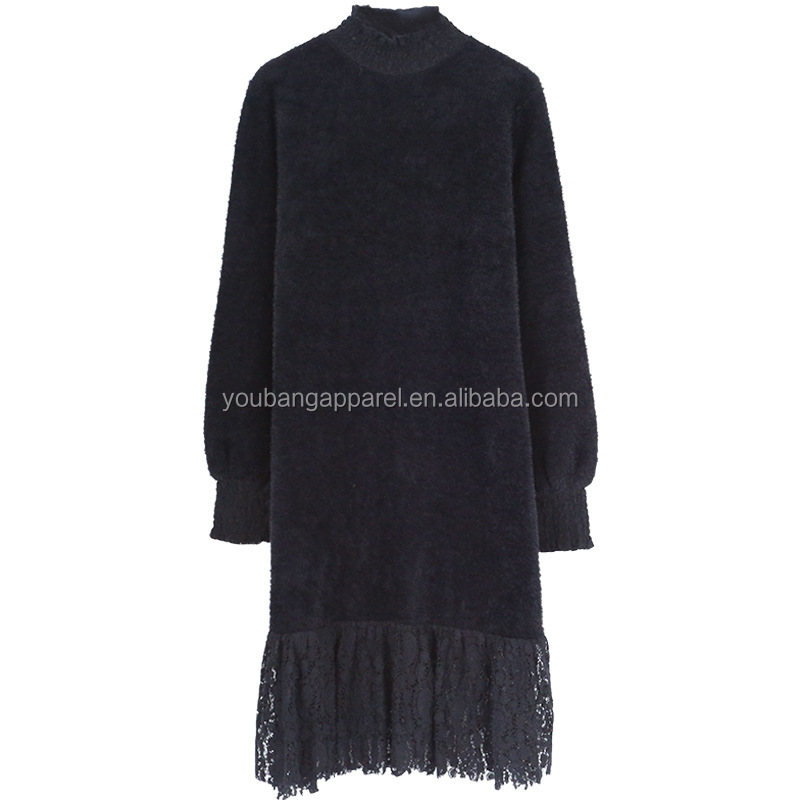 Wholesale new arrival high neck loose fit lace patchwork women long sweater dress