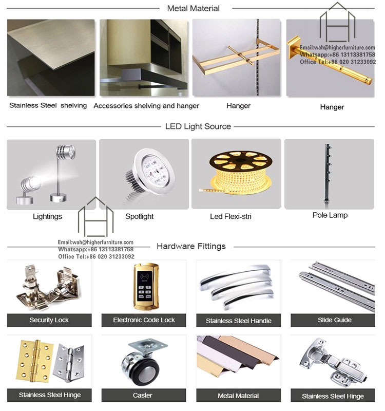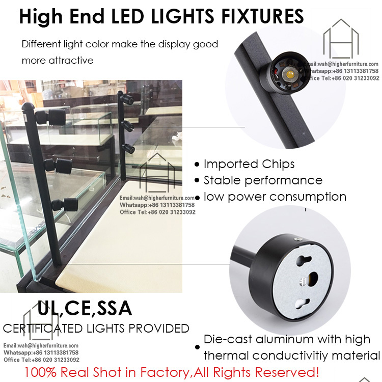 | usage: | Shop Fixtures/Glass Display Cases/Showcase Displays | other materials: | Tempered glass, LED lighting, stainless steel, LOGO, veneer, etc. |