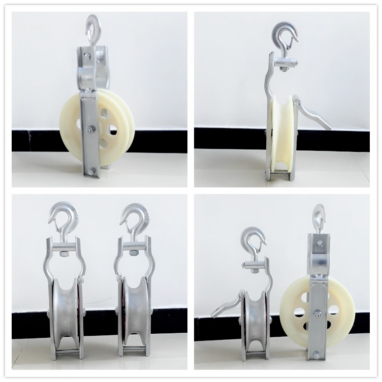 c. The pulleys of the pulley block are made of high-strength nylon or aluminum material, and the frame of the pulley block is made of galvanized steel. The transverse pulleys are mounted on ball bearings.