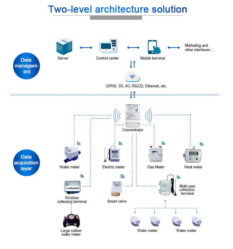 The two-level architecture scheme is suitable for areas with fewer users. One concentrator can collect data from 1000 meters, which greatly saves the cost of the collector.