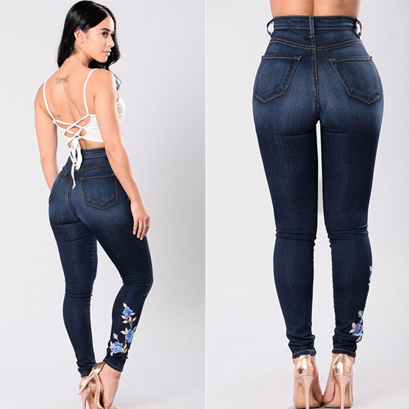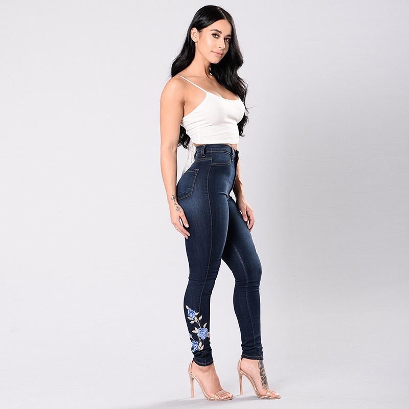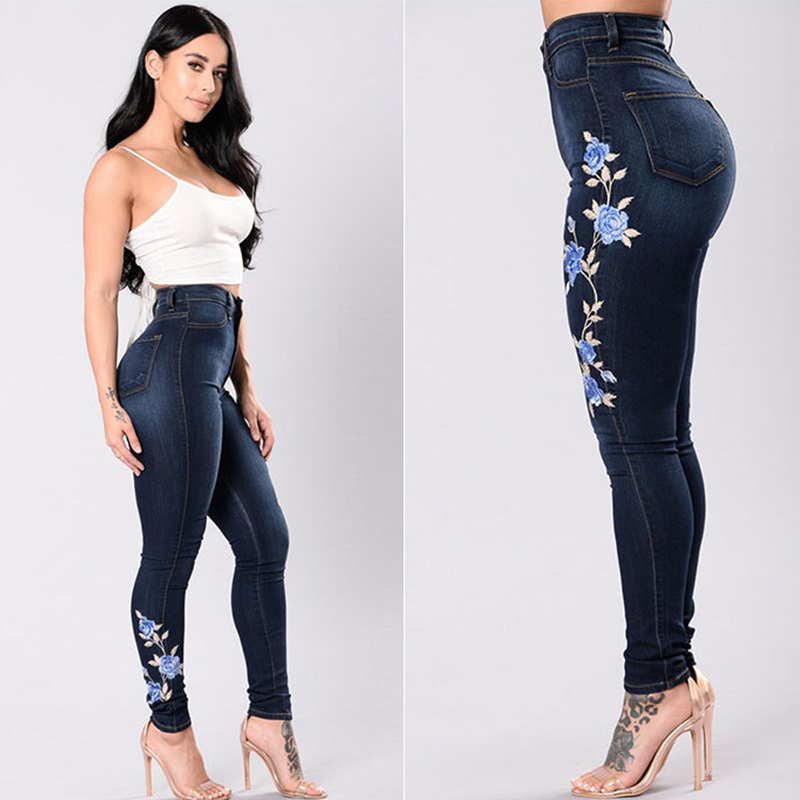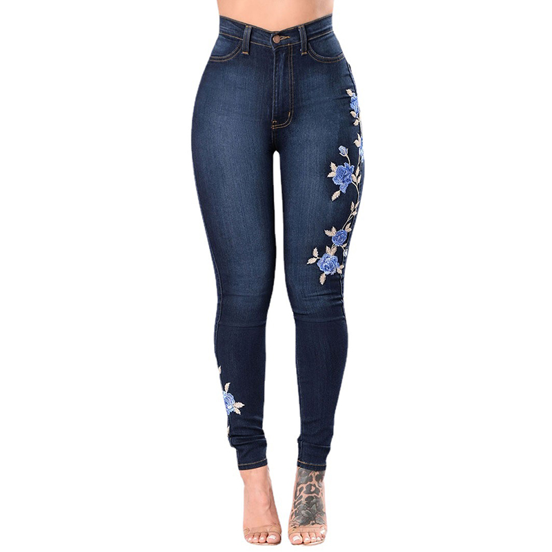 Women's Stretch High Waist Embroidered Plus Size Jeans Floral Print Denim Trousers Women's Fashion Pencil Pants