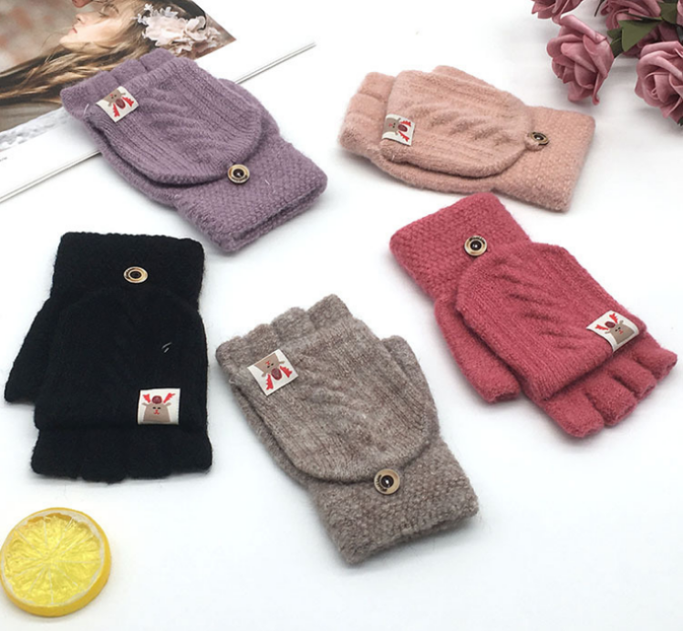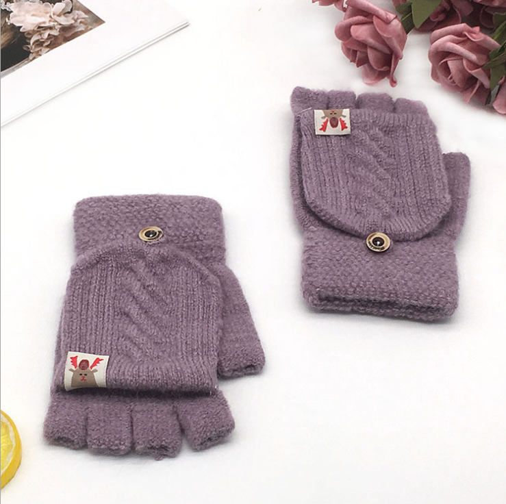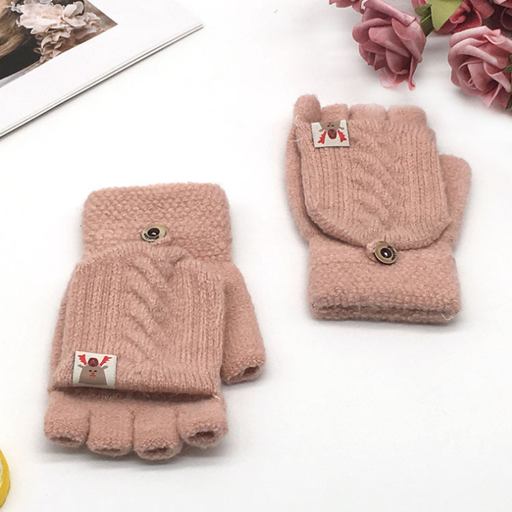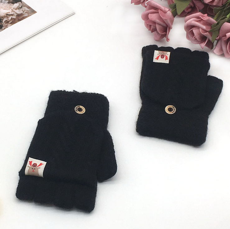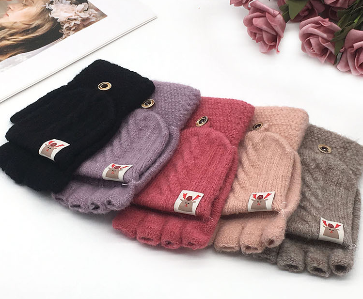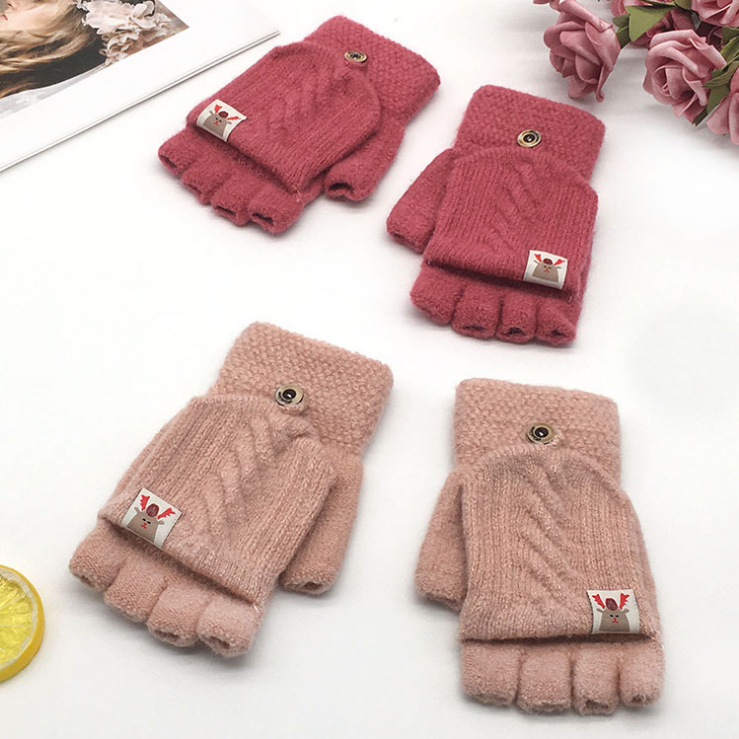 Women's gloves winter warm cute student cartoon knitted jacquard flip half finger dual-purpose gloves