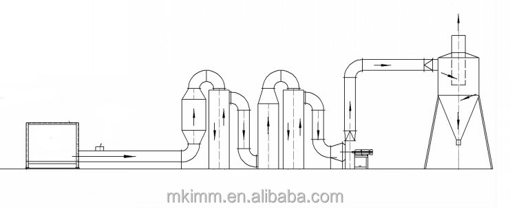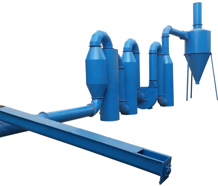 ² After the hot air produced by the oil-fired boiler is mixed with the wet material, it is quickly sucked into the pipeline by the exhaust fan (fan). Then the hot air flows through the curved pipe and the buffer (drying chamber) of the dryer, thus completing the drying of the wet material, and the dried material is discharged from the outlet with an air lock.