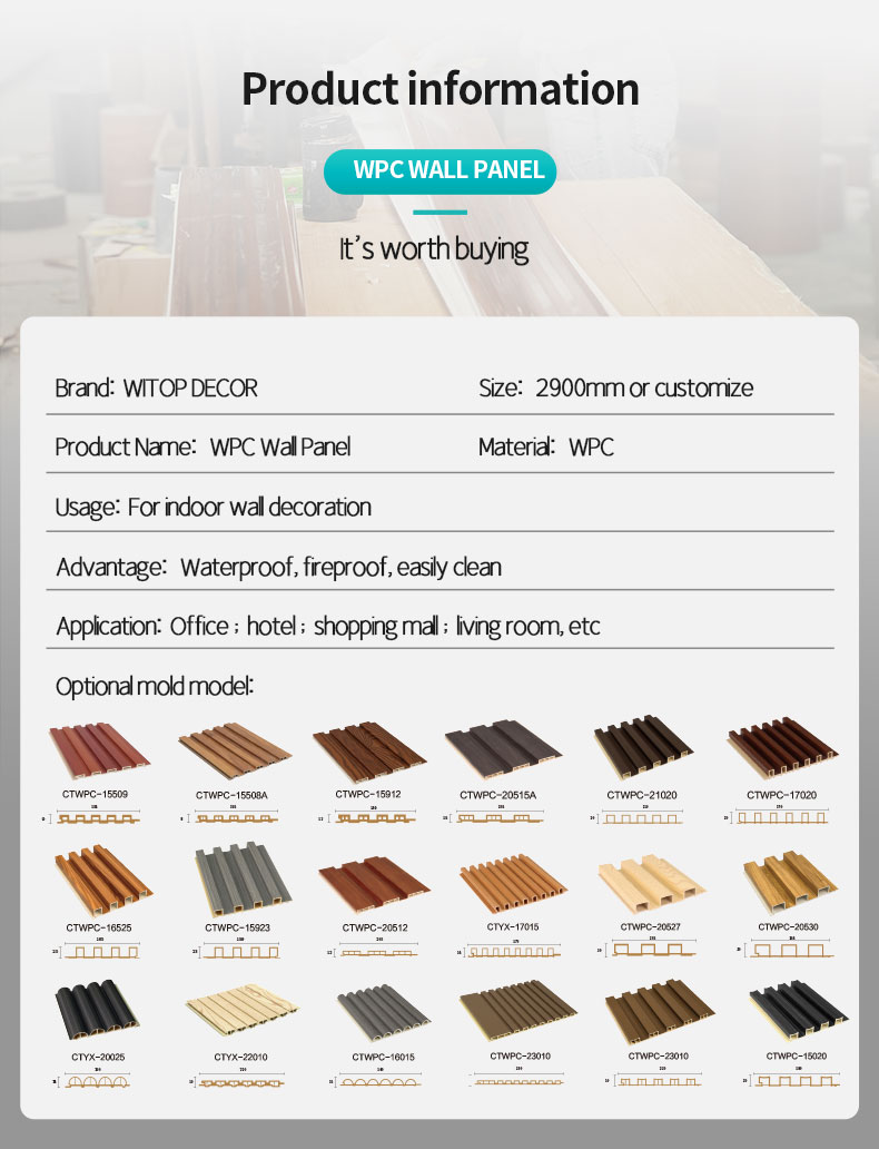 | product name: | wood plastic wall panel | application: | Office; Hotel; Shopping Center; Living Room, etc. |