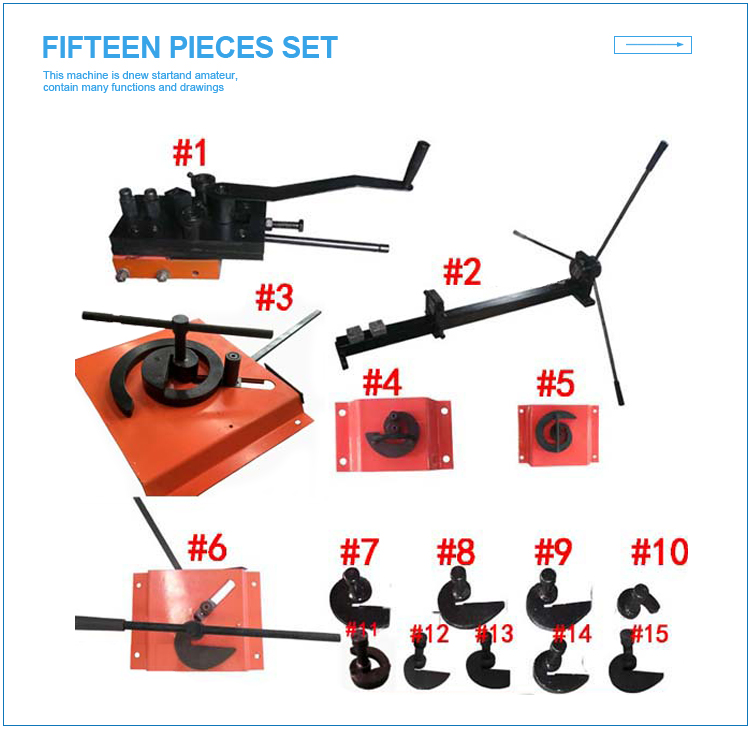 This unit is designed for novice investors and amateurs and contains many features and drawings. This tool set contains 13 scroll benders, 1 arc and angle bender, 1 twist tool, 15 pieces in total. It can bend iron and steel with a thickness of less than 10mm into C, S, and P shapes. It can also bend iron into angles, arcs and circles. It can twist iron and steel smaller than 8x8mm. The drawing is novel and the operation is convenient. You can incorporate these patterns into many wrought iron products. It is a must-have machine for new learners.