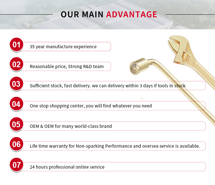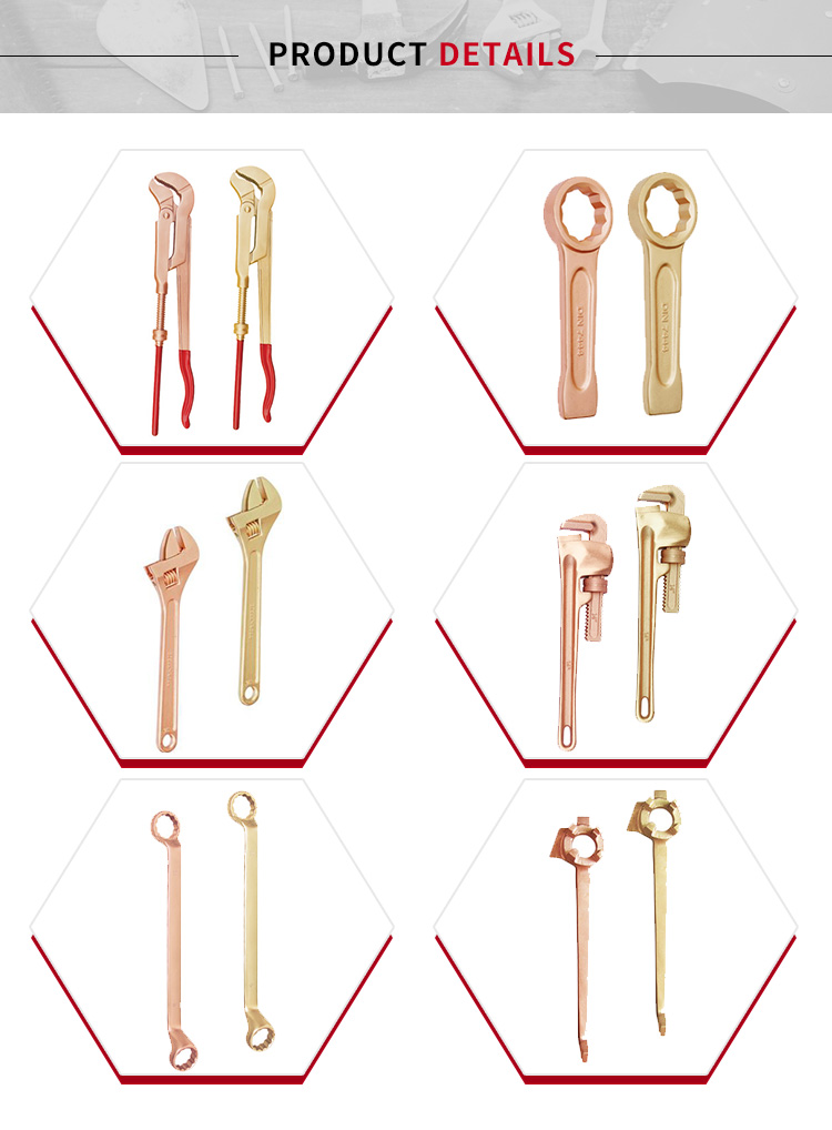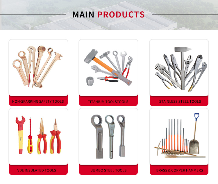 We have more than 360 items, more than 5600 specifications of non-sparking tools in two materials, beryllium copper alloy and aluminum bronze. All products 100% meet Japan's JIS M7002-96 and GB 10686-89 tests to prevent tool impact, sparks when rubber collides with targets in explosive environments or flammable vapors, widely used in oil and gas engineering, petrochemical plants, explosives plants , mines, shipyards, pipeline construction, military, pharmacies, airports, etc.