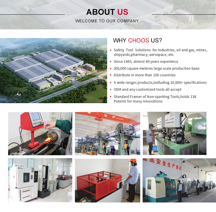 Our company was established in 1983, located in Botou City, China, with a registered capital of 80 million yuan. Specializing in the production of non-sparking tools, special steel tools, titanium tools, insulating tools, stainless steel tools, there are 680 employees, 28 senior engineers, 396 personnel, covering an area of 66,000 square meters, a building area of 40,000 square meters, and 480 advanced equipment set. 98% of the equipment works well. We produce 5000,000 safety tools per year, 68% of which are exported. It is the world's largest manufacturer of non-spark tool safety tools