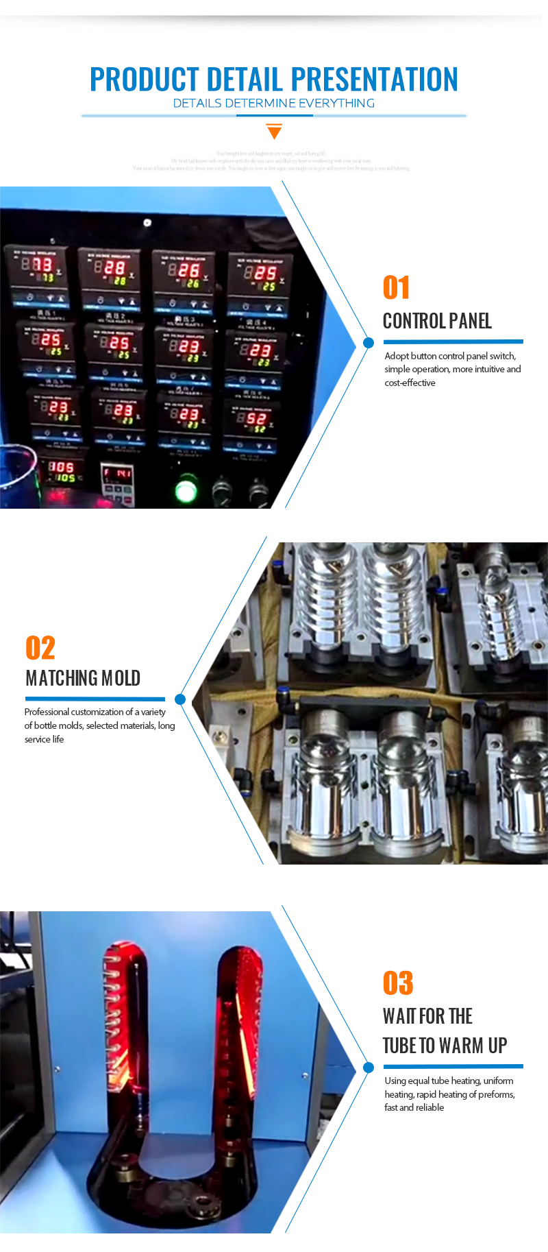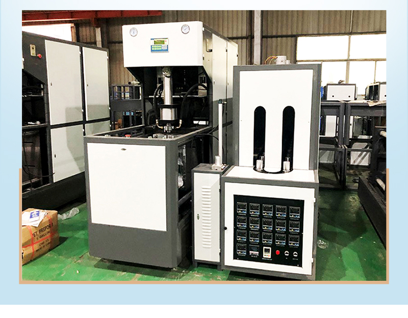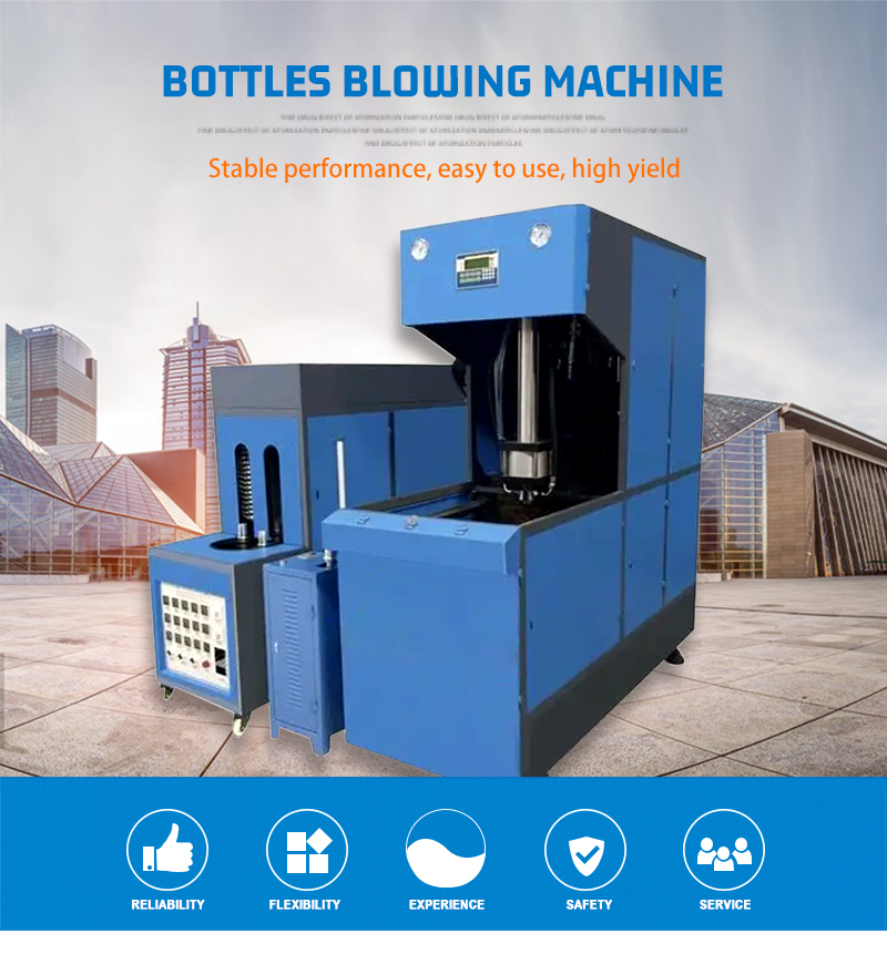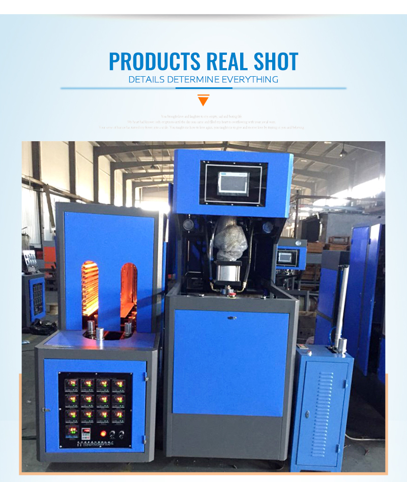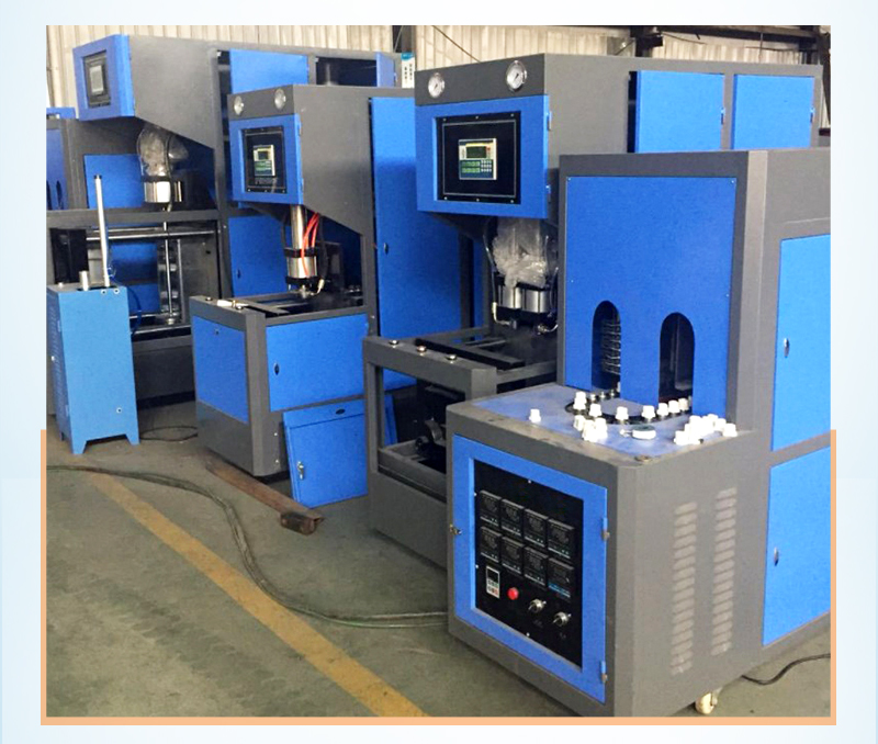 The semi-automatic bottle blowing machine is suitable for producing PET plastic containers and bottles of 100ml-2000ml (2 cavities) or 2.5-3L (1 cavity), it has 1 infrared heater+1 bottle blowing machine and 1 infrared heater+2 blow molding machine, depending on your budget and production speed requirements.