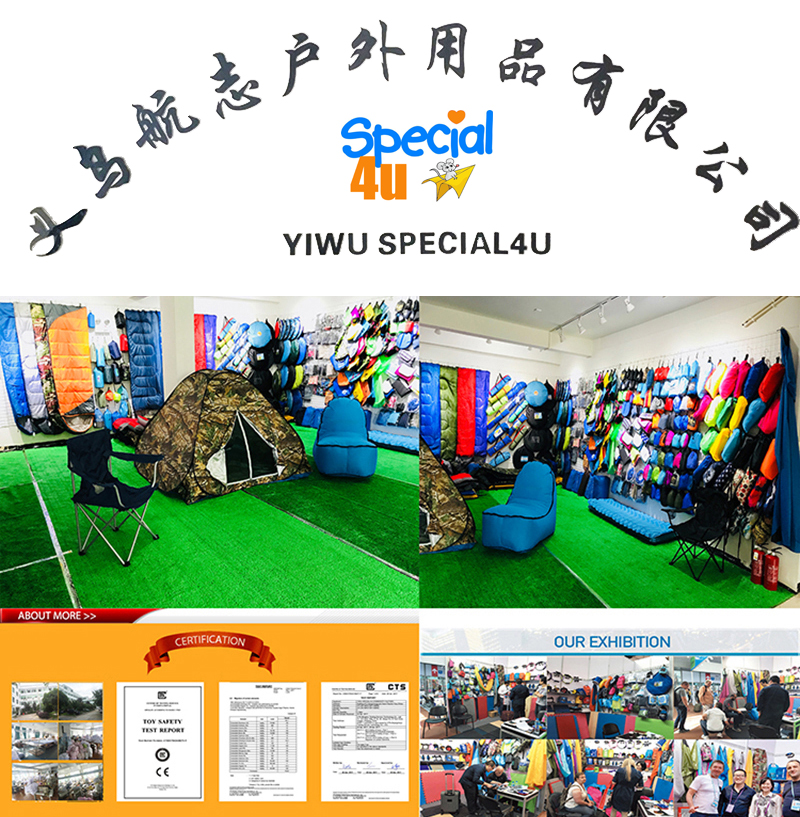 Yiwu Special4u is a professional outdoor products manufacturer in Yiwu, Zhejiang Province, China. Our products include Outdoor Tent, Folding Chairs, Hammock,Air Sleeping bag, outdoor waterproof dry bag,Picnic mats, etc.Adopting the modern production management, we have our own factory as well as several affiliated plants. We welcome customers' designs and ideas and can carter to clients' specific requirements.We have a well trained quality control team, new product hunter team, professional photographer team and customer service team.